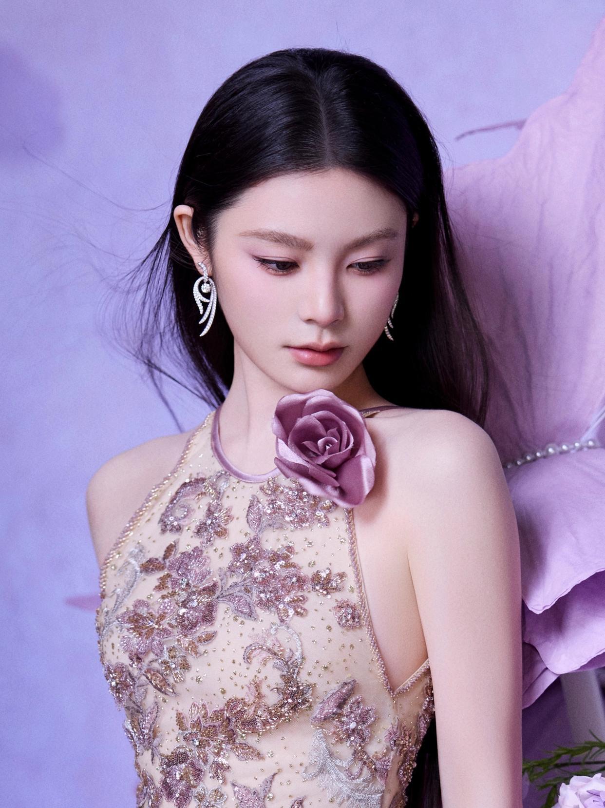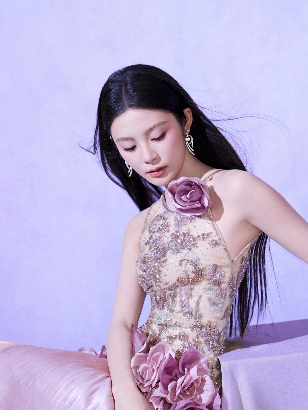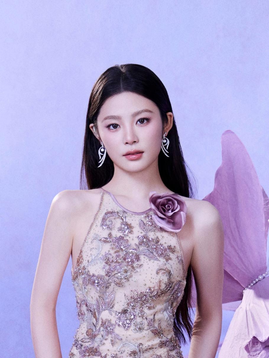姚晓棠这条浅蓝缎面吊带裙—y肩带镶满碎钻像裹了层星光,收腰+伞裙衬得腰细腿长,站在暖光里像把月光揉进了裙摆,举着话筒唱歌时,连发丝都裹着温柔的氛围感