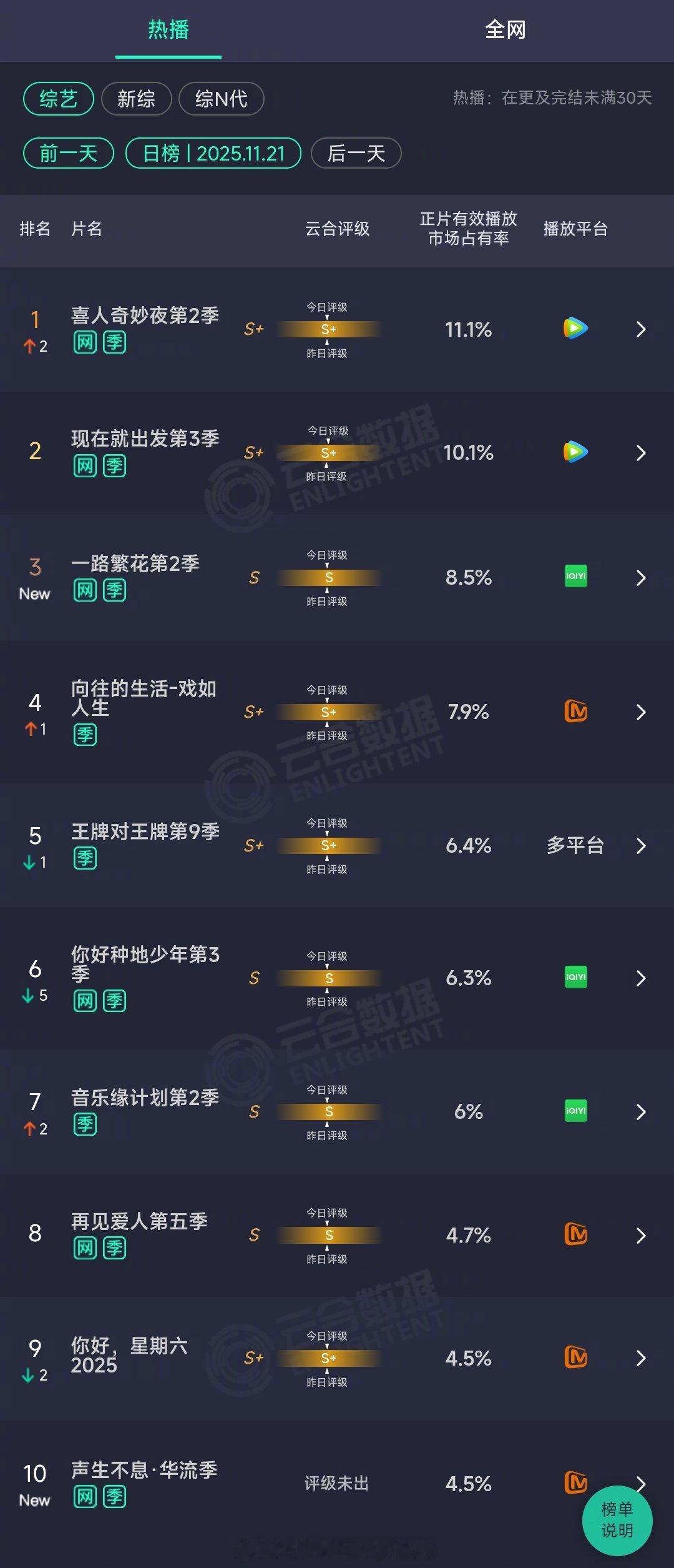2025年11月21日云合综艺正片有效播放量市占率TOP101 喜人奇妙夜第2季 11.1% 登顶x8天2 现在就出发第3季 10.1%3 一路繁花第2季 8.5%4 向往的生活-戏如人生 7.9%5 王牌对王牌第9季 6.4%6 你好种地少年第3季 6.3%7 音乐缘计划第2季 6%8 再见爱人第五季 4.7%9 你好星期六2025 4.5%10 声生不息·华流季 4.5%