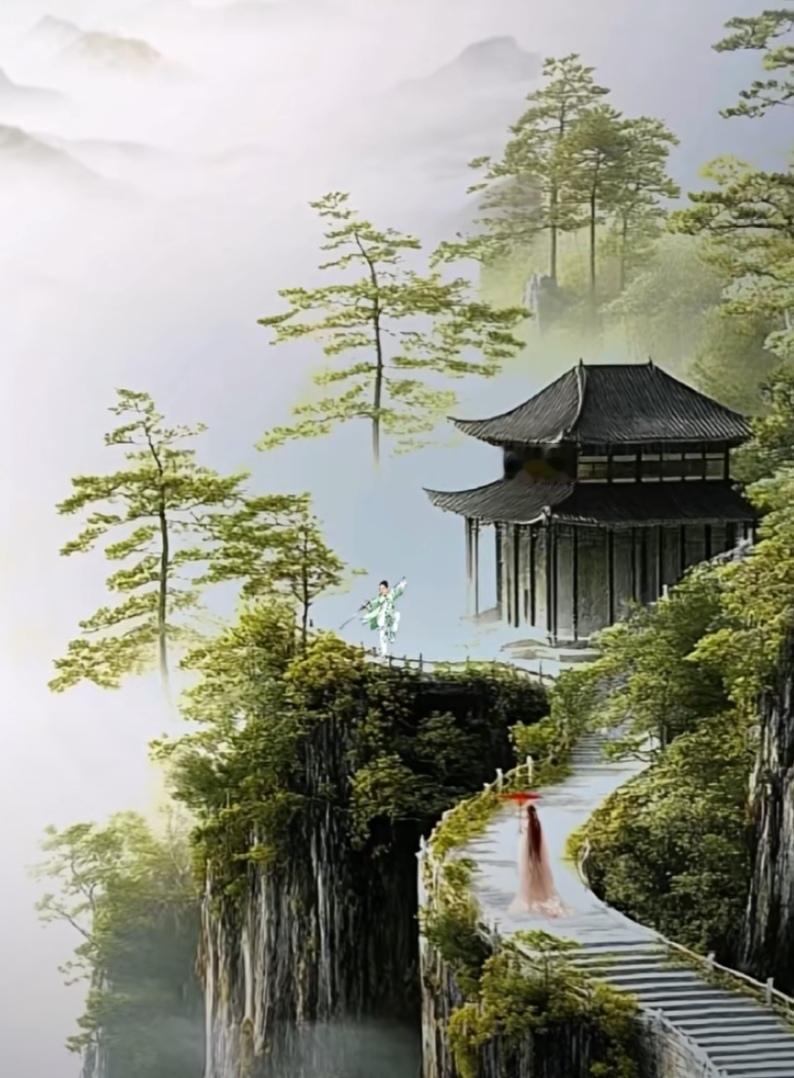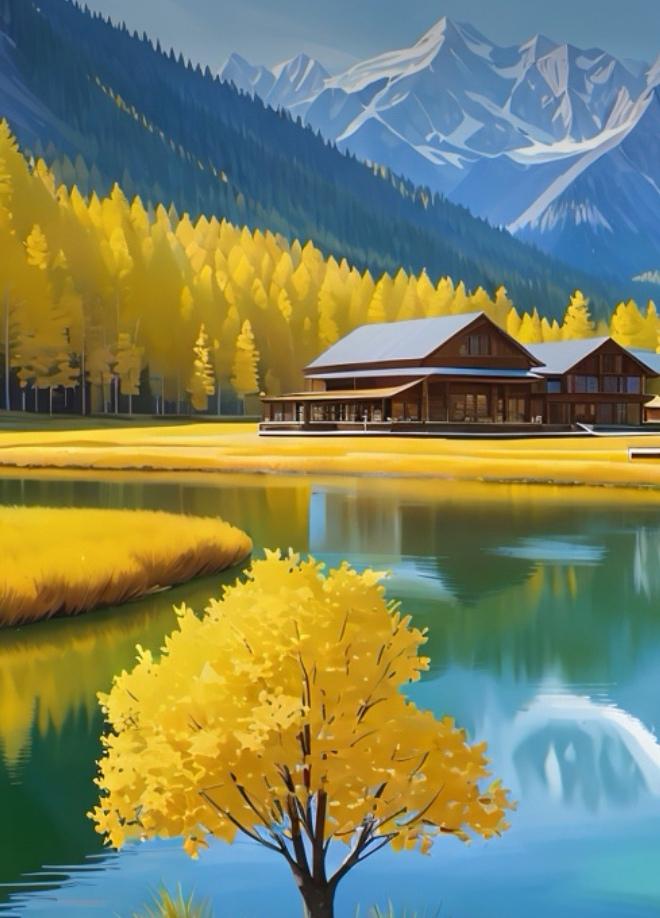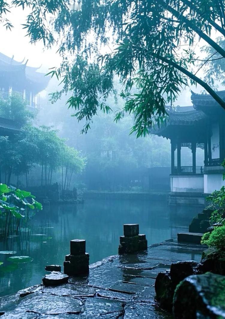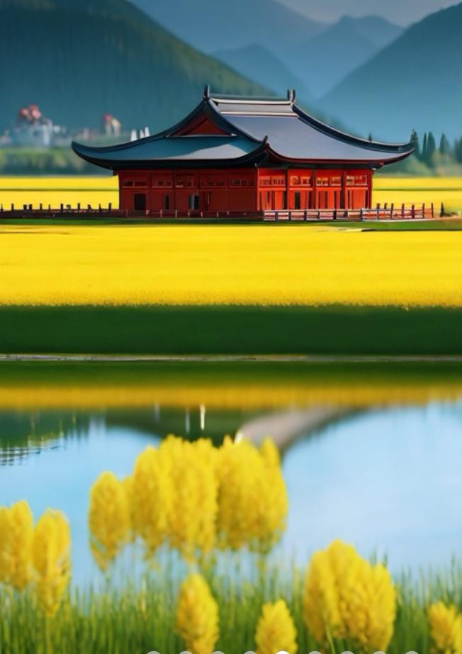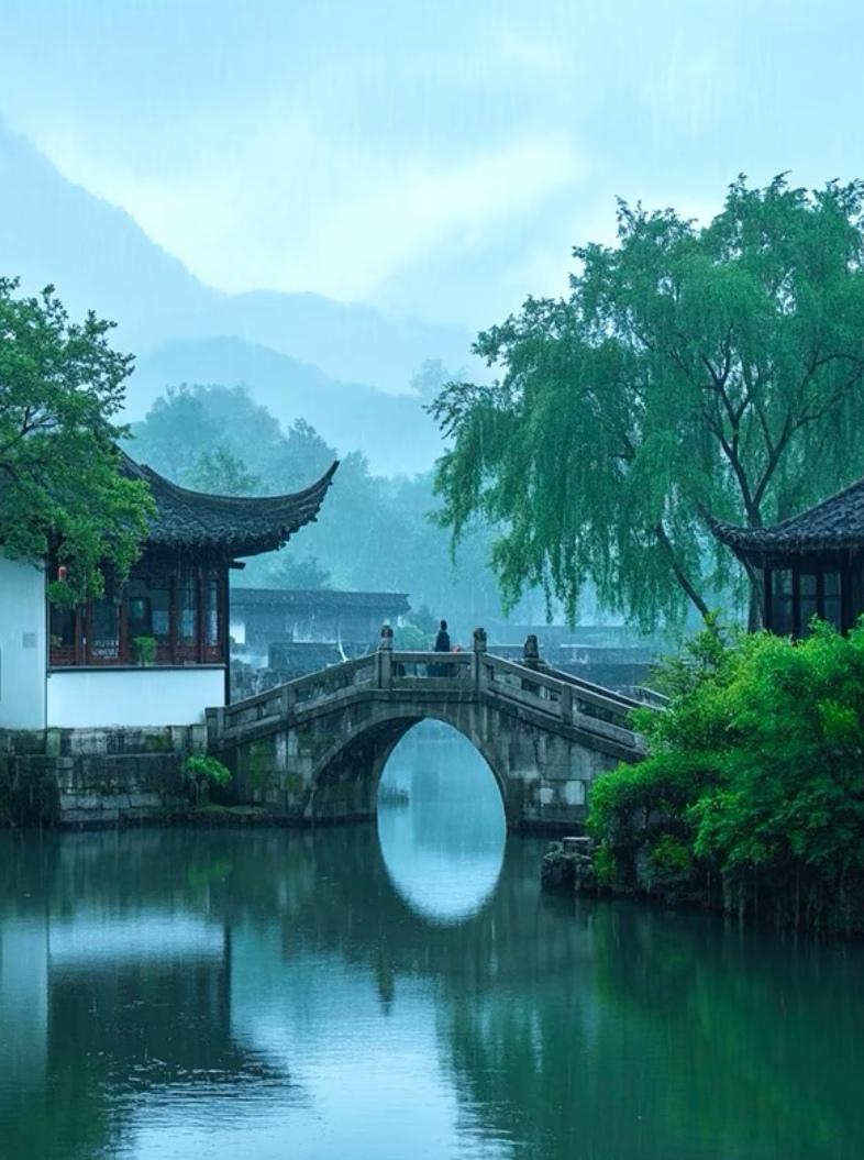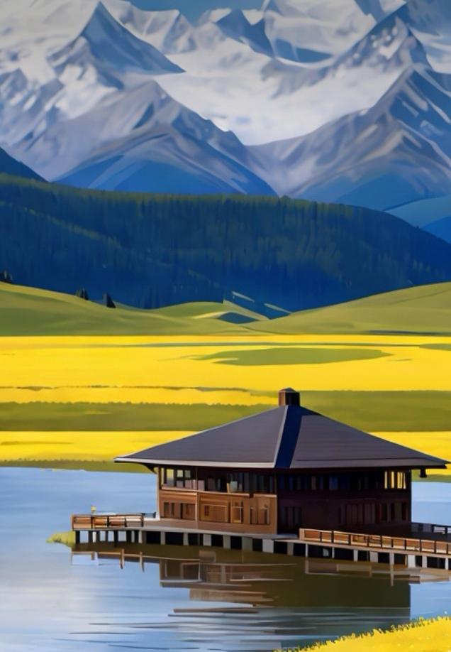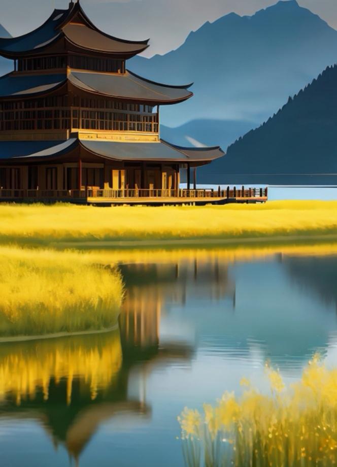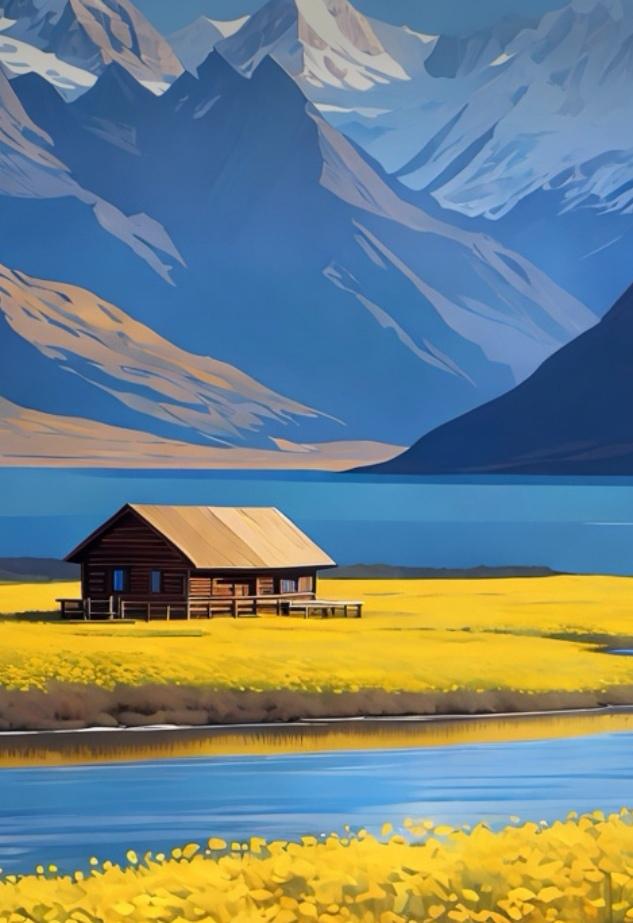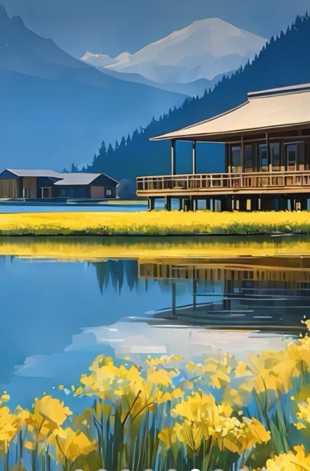 小屋依山傍水边, 云影天光共缠绵。 清风拂面心神爽, 此景此情胜桃源。