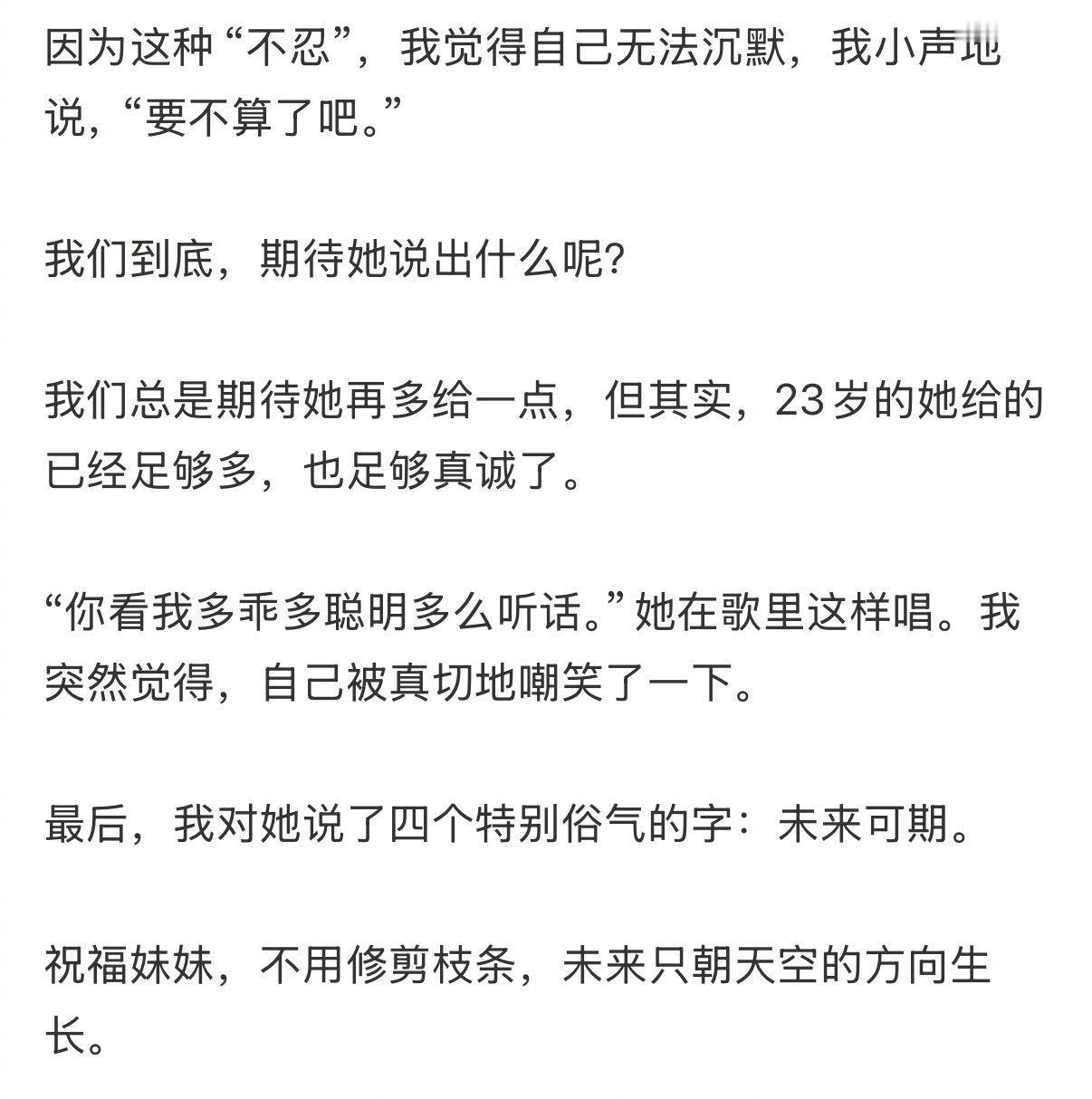 一段 秋日午后的采访回忆,竟藏着最戳心的温柔!采访尾声记者想请她补充表达,她轻声应下“我知道”,却陷入沉默那份不想敷衍却懂无恶意的内心挣扎,让记者都忍不住轻声说“要不算了吧”。我们总盼着她再多给一点可23岁的她早已把真诚捧在手心:敢用《李白》打破框架,也会在《珠玉》里把温柔刻进骨子里,歌里的全力以赴,发言里的大大方方,提及自己总是和时代相联,在幸福时代下汲取养分的真诚歌者,努力兑现天赋就是她的全部,这样的小单真的太难得了!
