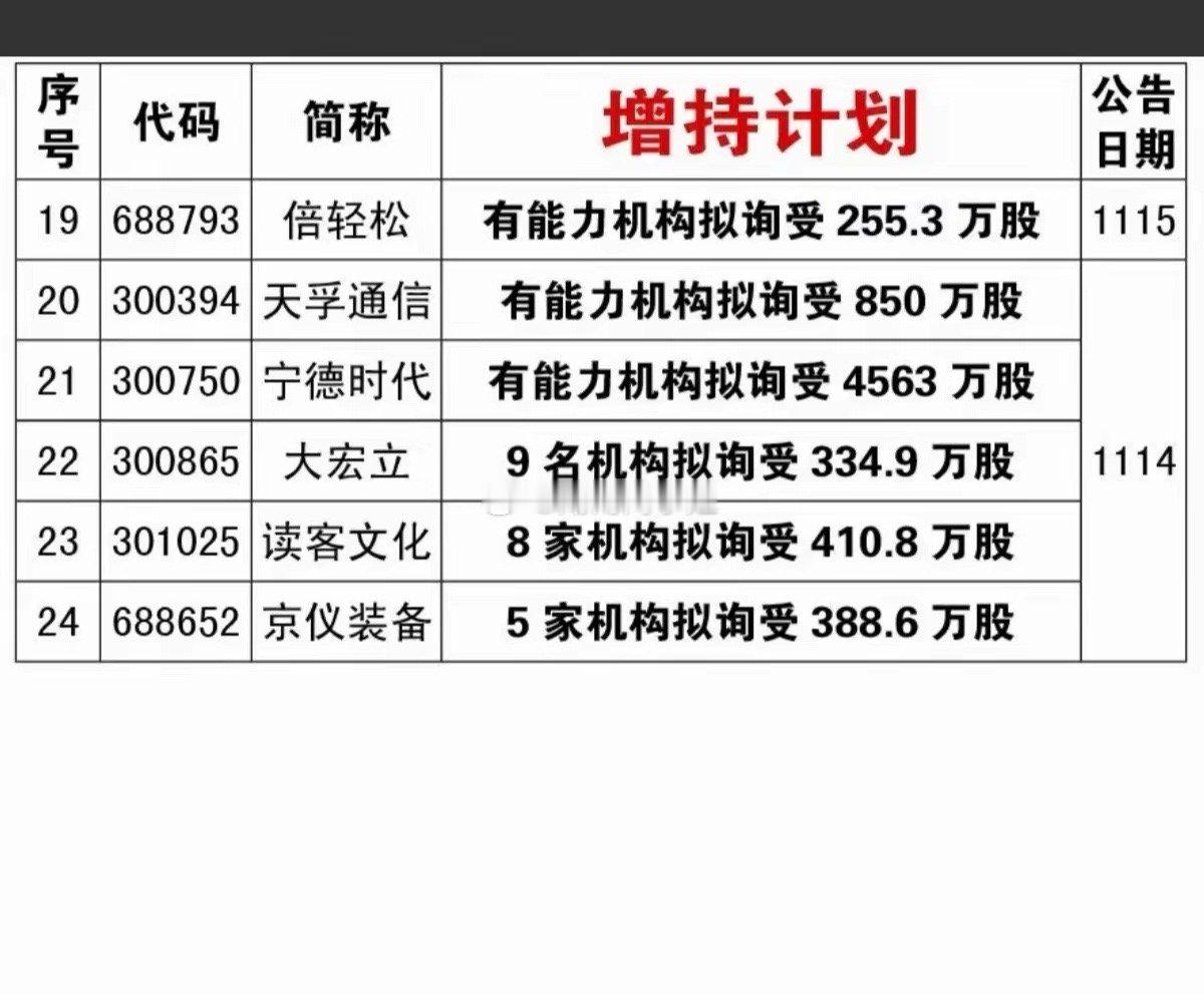 本周:24家上市公司 披露增持计划!(11.15~11.22)这个时候能增持的,绝对是良心好公司,也说明看好公司未来的发展!