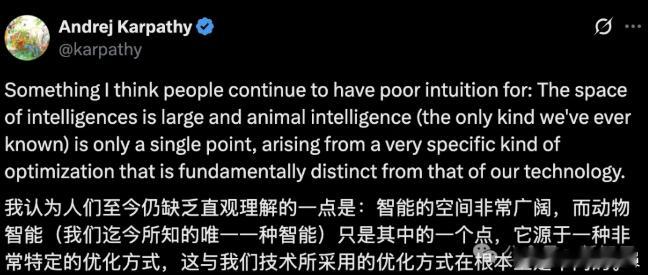 OpenAI前专家:AI不是人,我们想错了!当地时间21日,OpenAI创始成员之一、著名AI专家Andrej Karpathy发表推文,强烈反驳将大模型视为“更聪明人类”的普遍认知。他明确指出,大语言模型是人类历史上首次接触到的“非生物”智能,其进化机制、学习逻辑与运行原理与人类智能存在根本性差异。正确认识这一本质,对理解AI技术发展至关重要。Karpathy认为,人类作为动物智能的顶峰,在初次面对非生物智能时,往往会不自觉地套用理解人类思维的模式去看待AI,但这种直觉是“完全错误”的。他强调,智能的谱系极为广阔,而动物智能仅仅是其中的一个特例。人类智能的形成源于特定的生物进化路径,与大模型通过数据训练和算法优化的进化方式截然不同。尽管当前的大模型(如ChatGPT、Claude、Gemini等)在交流互动中表现出类人特征,但它们绝非数字形态的人类智能复制品。本质上,它们代表着一类全新的智能形态。Karpathy指出,关键区别在于二者面临的“进化压力”与发展目标完全不同。这种根本差异决定了大模型与人类智能在长期演进中将走向不同方向。Karpathy呼吁,建立正确的“内在认知模型”是理解当下AI并预测其未来发展的关键。如果固守将AI类比为动物智能的思维定式,人们就容易陷入认知误区——为其赋予欲望、恐惧、自我意识或情绪等人格化特质,而这些纯属人类的错误想象。他表示,清醒认识到大模型是一种独立于人类的全新智能类别,已成为把握人工智能时代的认知前提。