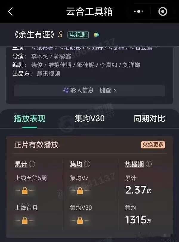 张彬彬、毛晓彤 11.20云合热播期🔚结束云合确值2.37亿(2.365-2.374亿),集均1315万猫儿这边2.365亿,集均1314万,完全在范围内了,所以集均误差1