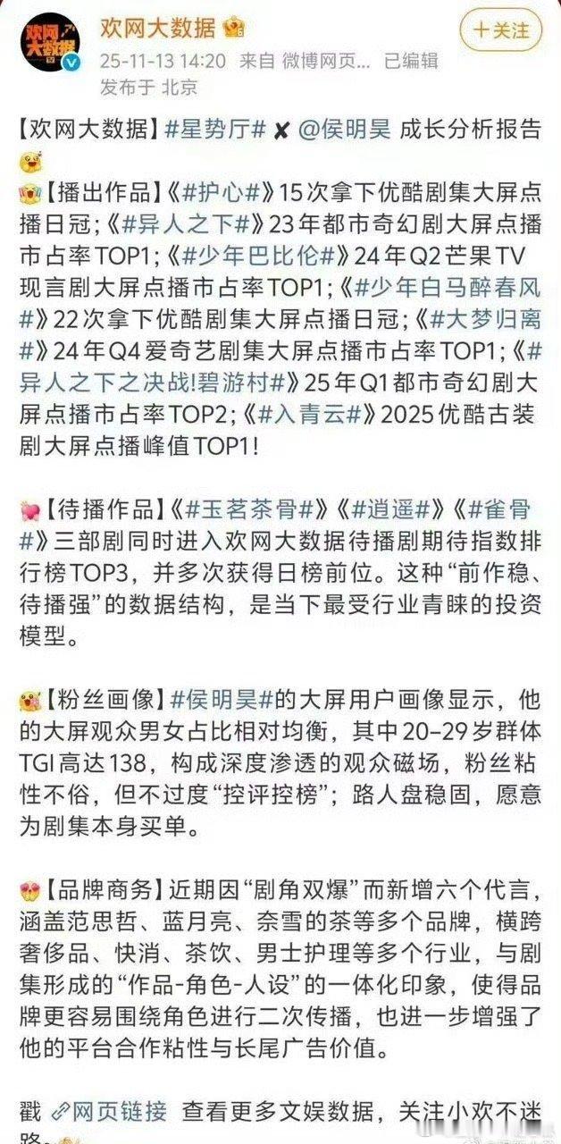 侯明昊《入青云》热播期,微博涨粉80多万,新增8个商务代言还拿下车代品牌代言人,行程更爆满,有效剧播具象化!