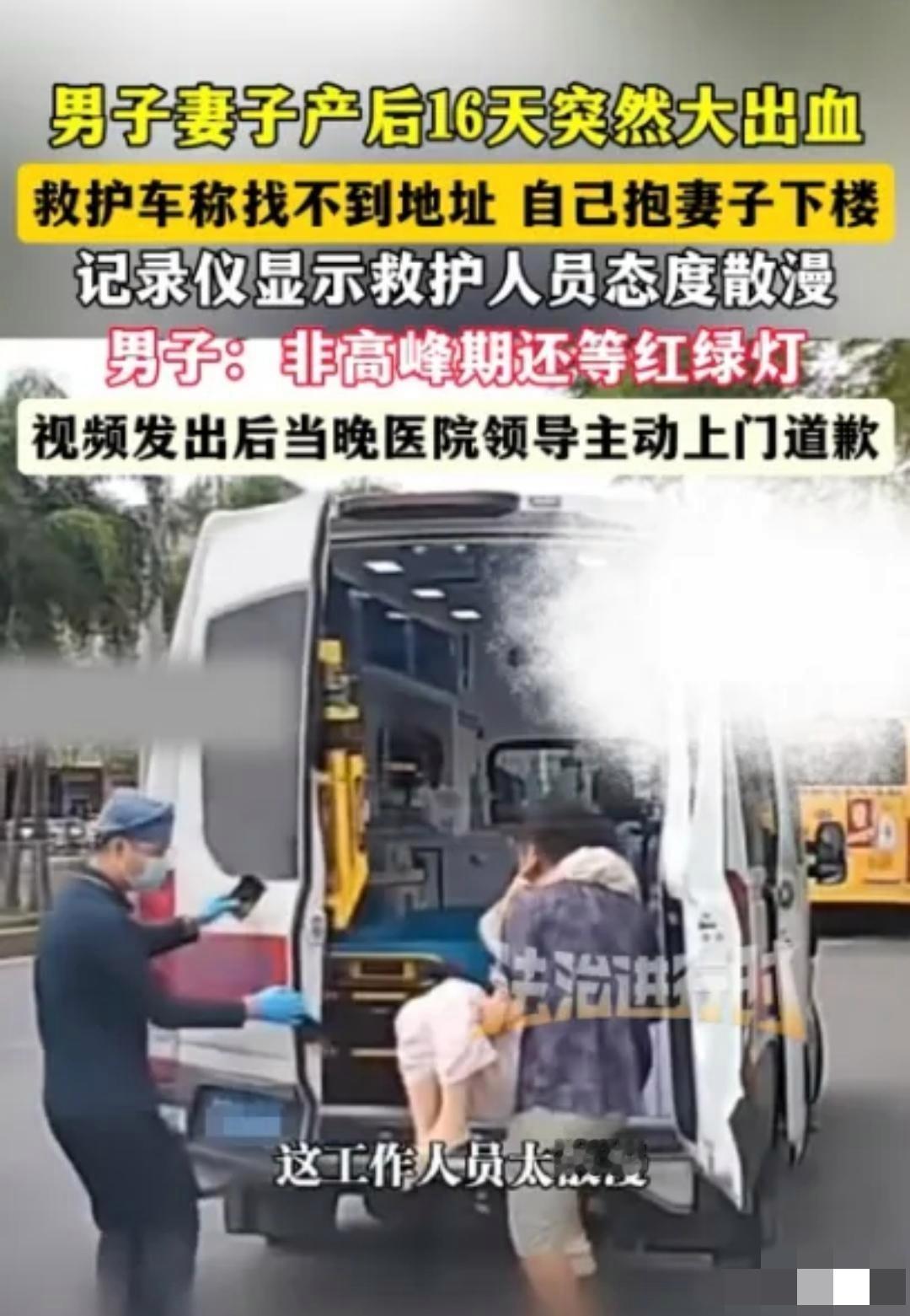 “必须严查到底!”最近,广东深圳有位女士在家突然大出血,她老公急急忙忙叫了救护车,可没想到,对方却说找不到地方。男子没办法,只能抱着妻子到小区门口等,更让人意外的是,赶来的护士却很散漫,就站在一旁不动!网友们都说:这是拿生命当儿戏 那女士当时躺在沙发上,脸色白得像纸,身下的垫子都染红了一大片。她老公手忙脚乱打120,报地址时声音都在抖,反复说了小区名字和楼栋号,还特意提了门口有个蓝色报刊亭,好找得很。 挂了电话没两分钟,救护车那边又打来,说导航导不到,让再细说。男的一边擦妻子嘴角的血,一边对着电话喊:“我就在小区正门口等!举着件红色外套!你们赶紧来啊!”说完就抱着人往楼下冲,妻子在怀里哼唧着,气都快喘不上来了。 到了小区门口,风一吹,男的浑身是汗,怀里的人越来越沉。等了快十分钟,救护车才“呜哇呜哇”开过来。车门一开,下来个护士,慢悠悠地从包里掏东西,站在车边问:“病人咋了?” 男的急得直跺脚:“大出血!快救人啊!”护士瞥了一眼他怀里的人,没动地方,反而说:“你先把人放平,我看看情况。”那语气淡得像在说今天天气不错,手里还捏着手机,像是在回消息。 旁边路过的邻居看不下去了,冲护士喊:“你倒是快点啊!人都快不行了!”这时候另一个医生跑过来,赶紧帮忙把人抬上车,护士这才慢悠悠跟上去。后来听说,就因为这耽误的几分钟,女士到医院时血压都快测不到了,抢救了半天才脱离危险。 救护车是救命的车,医护人员是救人的人,哪能这么散漫?人家家里出了事,急得火烧眉毛,这边还慢悠悠的,这不是拿人命开玩笑吗?真要是耽误了最佳抢救时间,谁负得起这个责任? 各位读者你们怎么看?欢迎在评论区讨论。