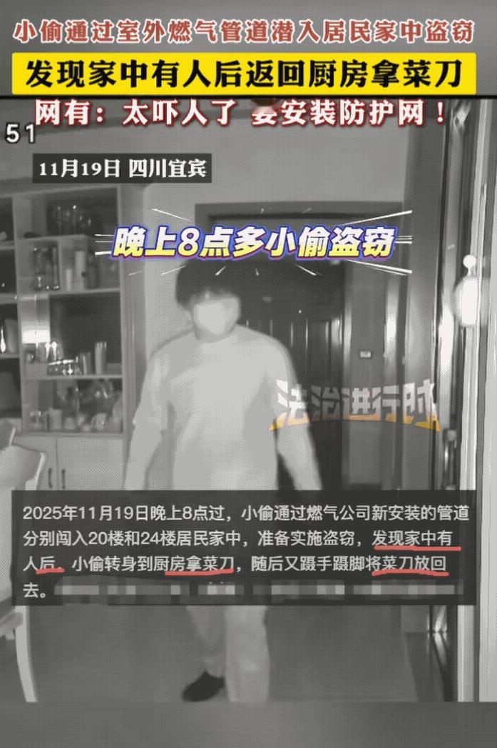 “万万没想到啊!”四川宜宾,一小偷顺着天热气管入户,发现有人后拿菜刀吓坏住户。 小偷顺着新安装的燃气管道,潜入20和24楼居民家准备行窃,结果发现屋里有人,令人没想到的是他没直接跑,反而去厨房拿了菜刀出来,之后又悄悄放回去了。 ​ 这事让不少网友后怕,有网友说:“所以大家睡觉的时候, 卧室的门一定要反锁。” 还有网友说:“有个朋友喝醉了忘带钥匙,住二楼,然后爬燃气管道回家,结果爬错单元了,半夜吓得人两口子半死,赔了5千块钱。” 也有网友说:“现在入室还有啥好盗窃的,包里没有现金,手机平板在枕头旁,电视机忒大搬不走,也不值钱,反正我家是没啥好窃的。” 在家时尽量锁好窗户,特别是靠近管道的房间,晚上可以拉上窗帘减少室内情况暴露。 ​ 如果发现家里有异常动静,不要贸然上前,先悄悄锁好房门,立刻报警。 (信息来源:法治进行时)