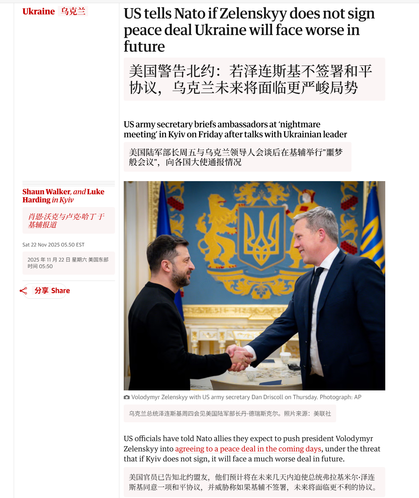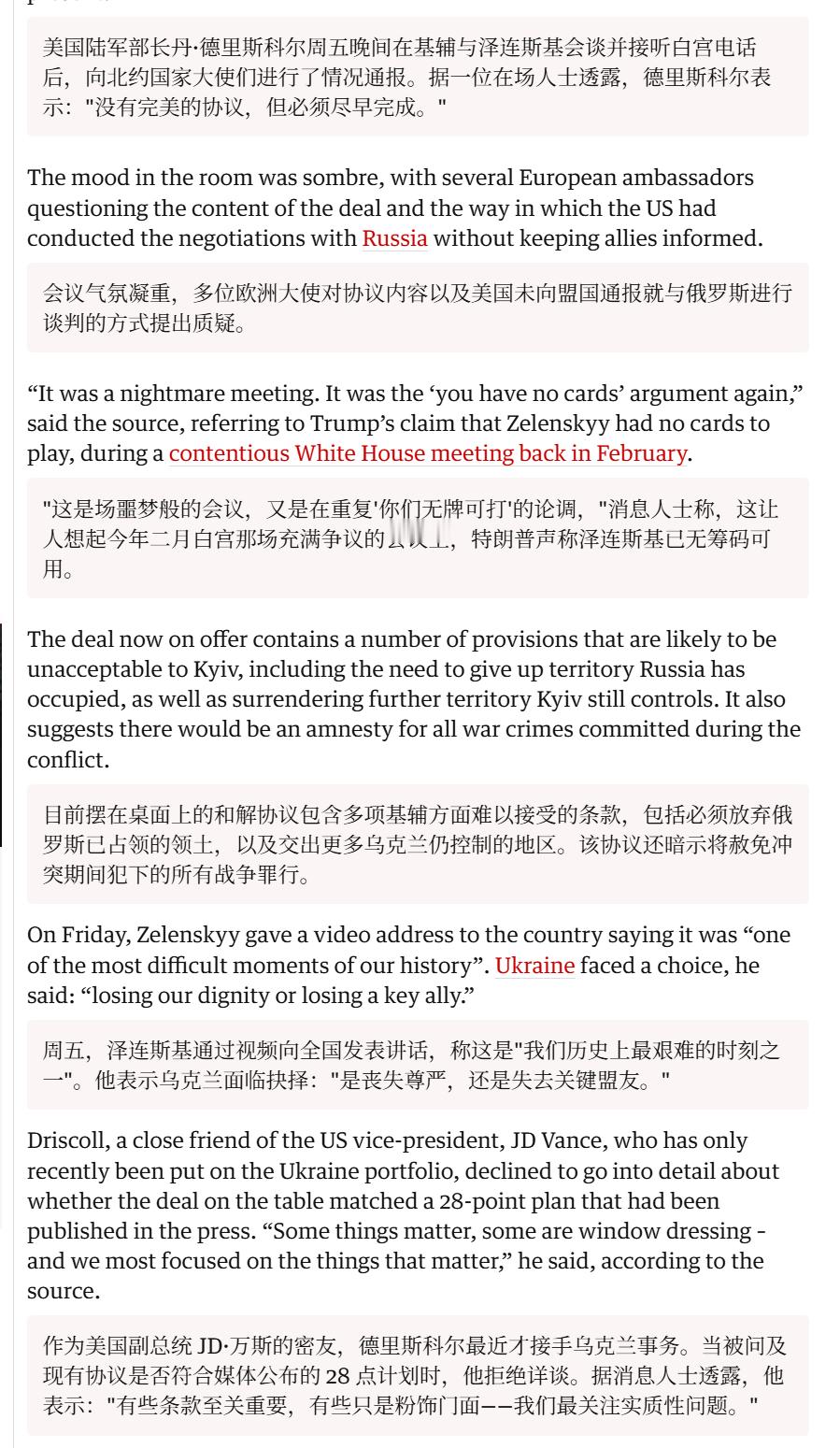 🔻《卫报》报道称,美国陆军部长丹尼尔·德里斯科尔向北约官员表示,如果乌克兰总统弗拉基米尔·泽连斯基拒绝特朗普的和平计划,他未来可能面临"更严峻局势"。🔻德里斯科尔强调必须尽快达成协议,否则基辅未来将面临更不利的协议。🔻随着特朗普将最后期限设定在下周四,泽连斯基称这是"我们历史上最艰难的时刻之一"。