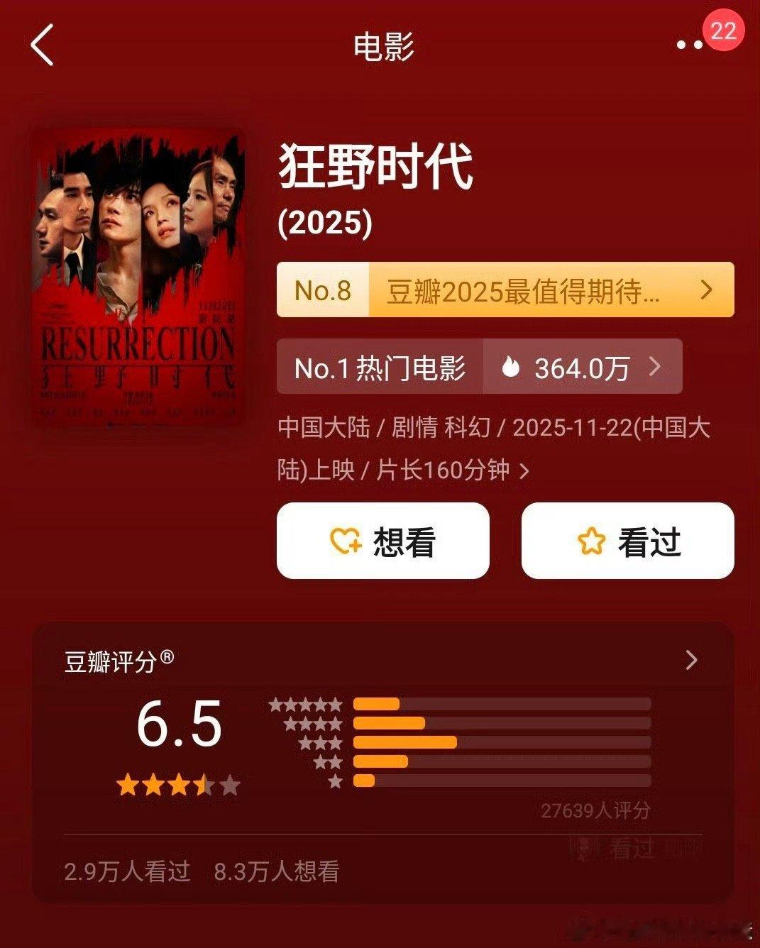 《狂野时代》上映第一天开分了,6.5分,2.8万人评分