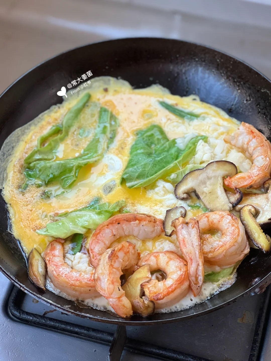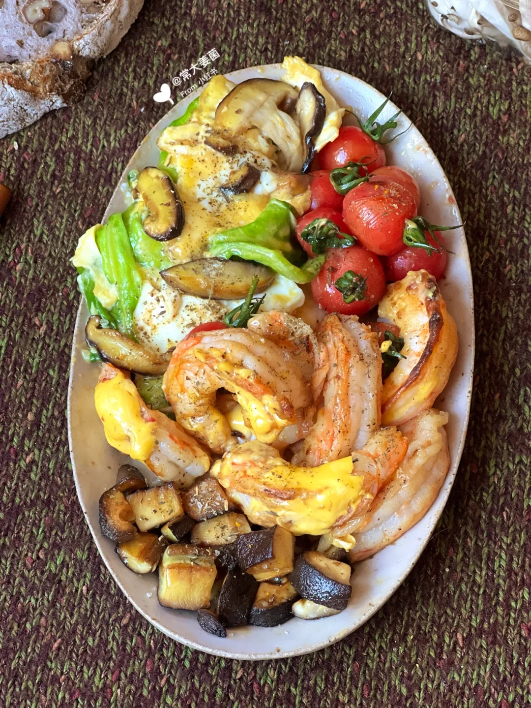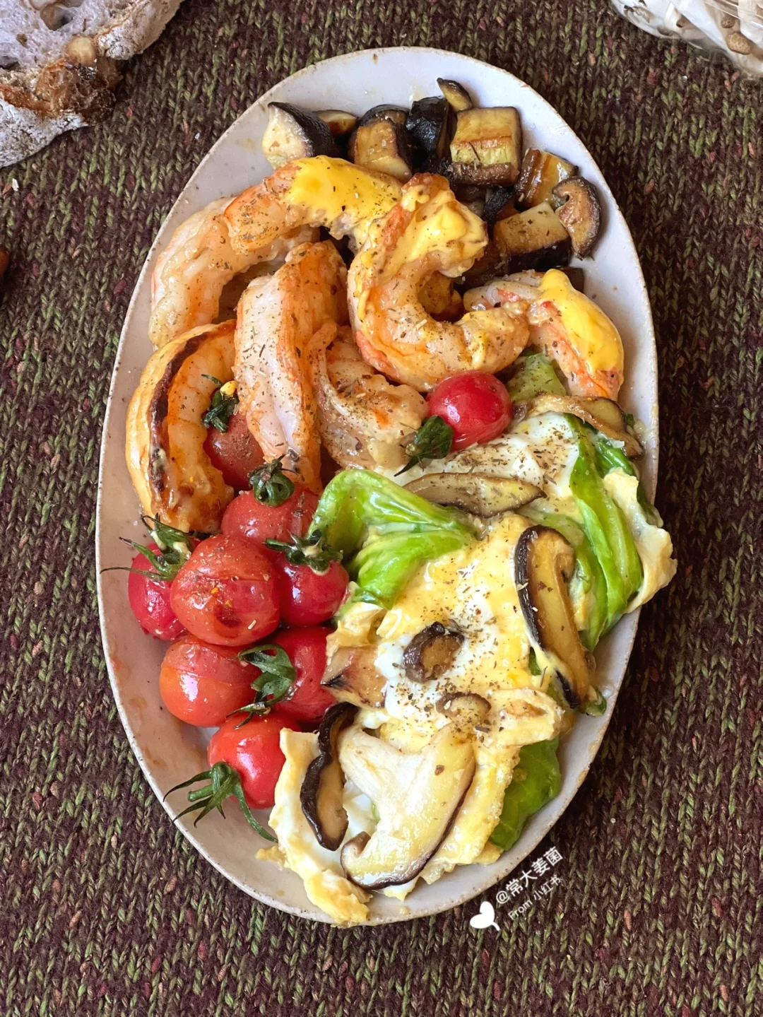 ✨🦐🥚(蛋白)&🍄🍅🥬(维生素和纤维素)&一片全麦酸欧(粗纤维)&一把坚果(优质油脂、粗纤维)。