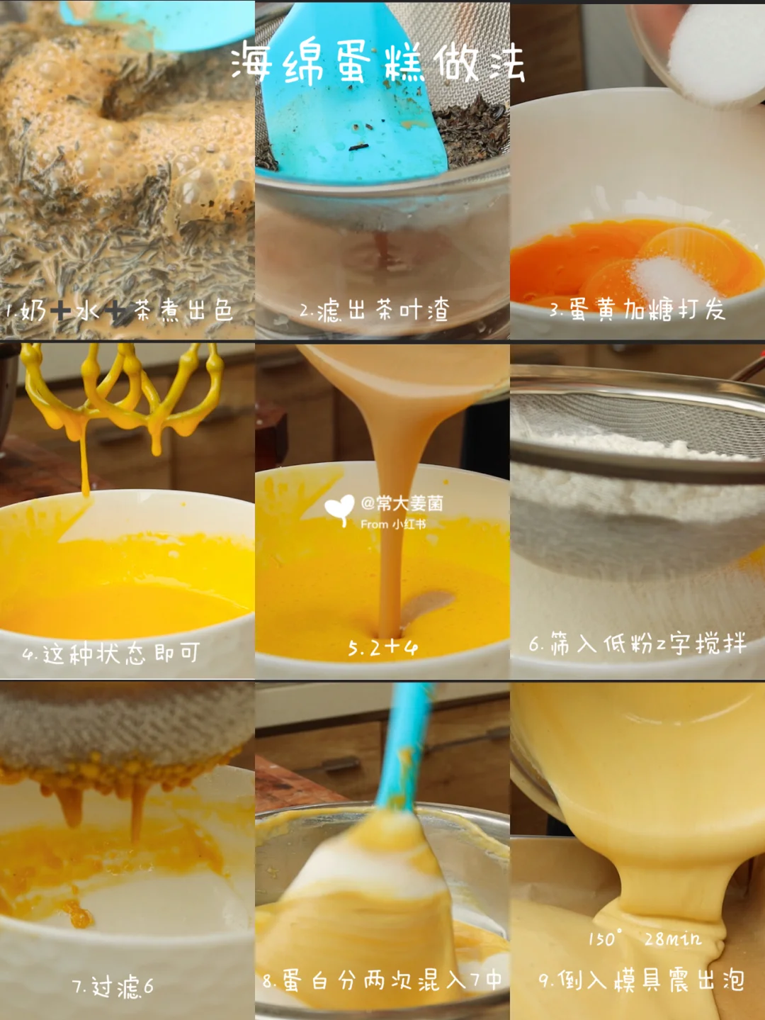 1.热水➕奶➕红茶煮出茶香,降到室温,➕油➕打发的蛋黄搅拌均匀