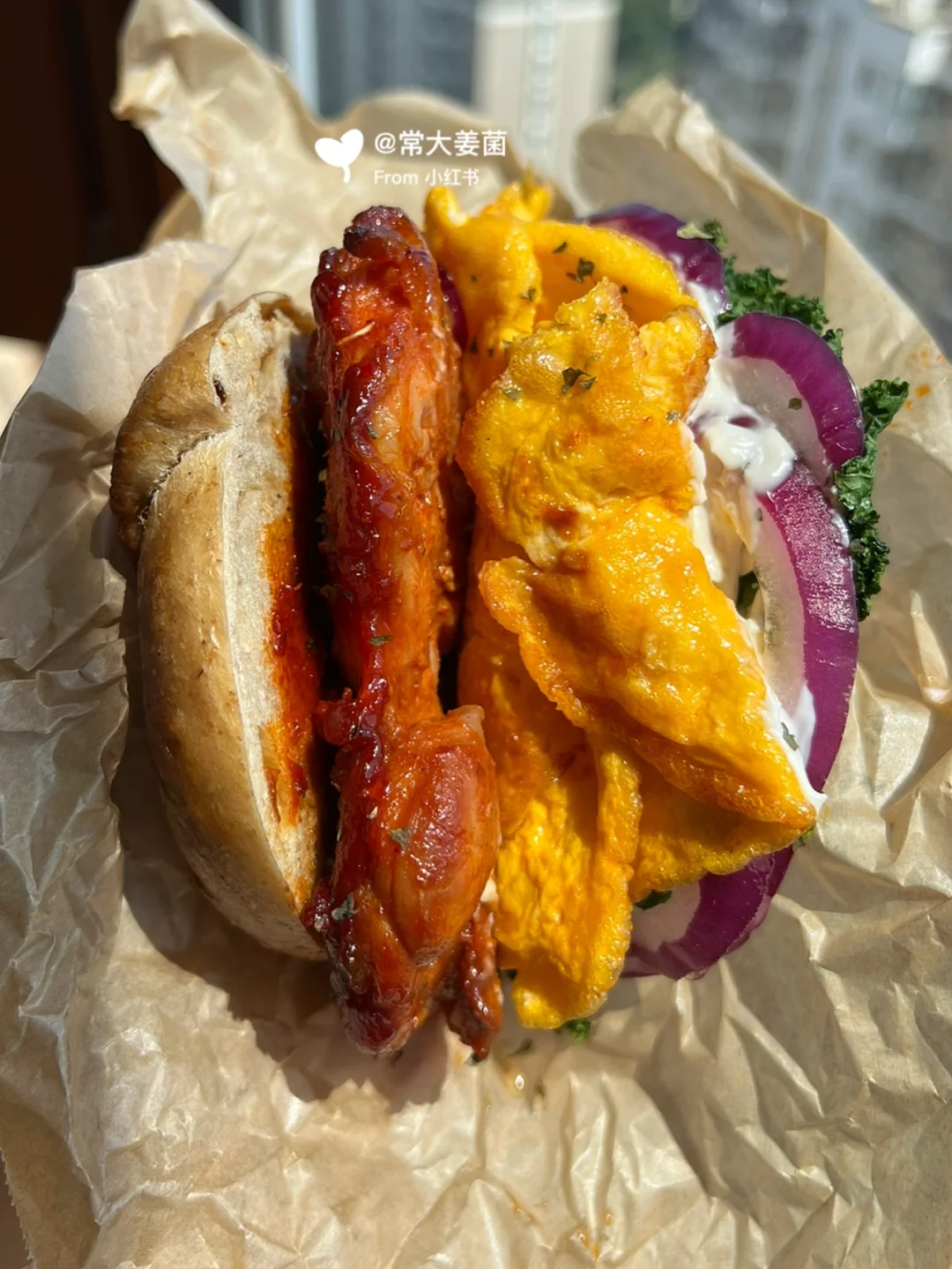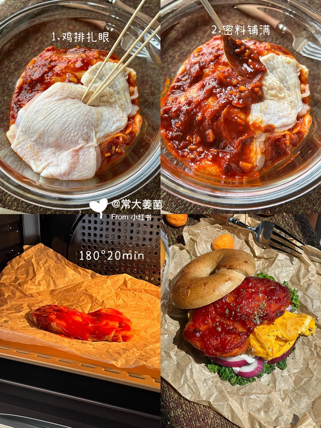 韩式甜辣鸡排滑蛋贝果汉堡🍔🍗是真的绝!
