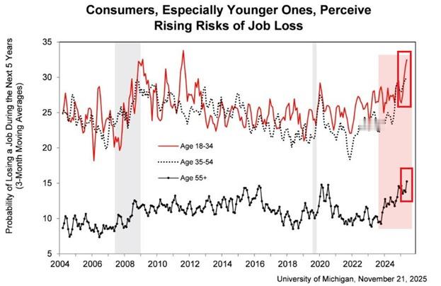 🔻密歇根大学的数据显示:目前,18-34 岁的美国消费者认为未来五年失业概率约为 33%,创下有记录以来第二高水平。🔻对于 35-54 岁的美国人而言,三个月平均值已达约 30%,创历史新高。🔻即使是 55 岁以上的消费者群体,其对就业前景的悲观程度也达到历史峰值,他们预估的失业概率约为 15%。🔻与此同时,68%的美国人预计未来 12 个月失业率将上升,这一比例接近 2008 年以来的最高水平。