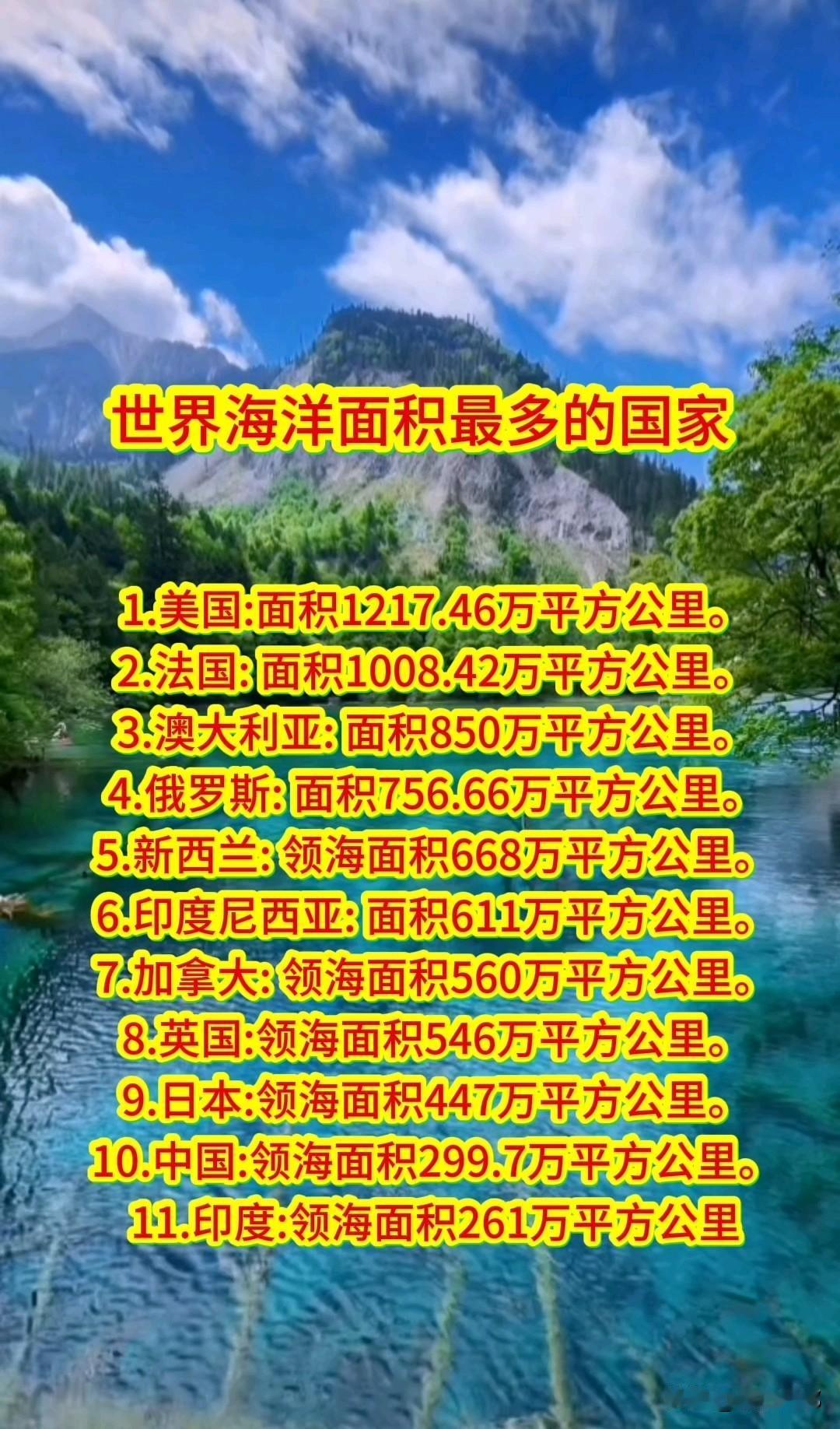 世界海洋面积排行榜,美国🇺🇸是一哥,陆地面积和海洋面积都大,也是厉害👍🏻!法国陆地面积很小,但海洋面积却超千万平方公里,世界第二,而英国也不小,都是殖民主义帝国的余茵,海外领地太多了! 澳大利亚独占一块大陆,加拿大面积大、海岸线长,新西兰、日本、印尼都是岛国,岛屿众多,跨度也大,导致海洋面积均为世界前列! 对比一下我国,虽然有渤海、黄海、东海和南海四大近海,但除了渤海以外,其他海域都是和邻国共享,大多还有争议,甚至为占领,导致我们名义上只有约300万平方公里,比日本小多了! 随着科技的进步,领海开发越来越受重视,尤其是海底资源开发,将会是未来人类腾飞的基础! 所以看领土面积,除了陆地面积,还得看看领海面积! 辽阔海洋风光 各国领土面积 美国 日本 法国 英国 科普