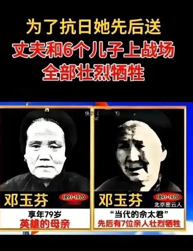 1949年秋天,密云猪头岭村的邓玉芬正在地里收红薯。58岁的她腰弯得很低,手上全是泥,突然听见有人喊:“你家永兴回来了!” 邓玉芬拔腿往家跑,六年了,她以为七个儿子全死在战场上,现在有人说老三回来了?会不会是哪个骗子冒充的? 红薯藤绊住了她的裤脚,她一把扯断,脚下的布鞋沾满泥土,跑起来一滑一滑的。腰上的旧伤是早年挑担子落下的,此刻被风一吹,疼得钻心,可她顾不上揉,只顾着往前冲。六年里,这样的“好消息”她听过三次,每次都是空欢喜——1944年,有人说见过老二,她翻山越岭找了三天,只找到一具穿着儿子旧军装的遗体;1946年,有人带话来说老四还活着,最后发现是同名同姓的战士;1948年,老五牺牲的噩耗传来,她在地里哭晕过去,醒来后还是咬着牙把庄稼收完了。 家门口已经围了不少乡亲,有人踮着脚往里看,有人低声安慰着蹲在门槛上的老伴。邓玉芬推开人群冲进去,就看见院里站着个穿灰布军装的年轻人,身形消瘦,左臂空荡荡的,袖口挽着,露出结痂的伤口。他背对着门,正在给老伴递什么东西,听见动静转过身,脸上满是风霜,眼神却带着熟悉的光亮。 “娘……”年轻人喊了一声,声音沙哑得像被砂纸磨过。 邓玉芬的脚步顿住了,浑身的力气仿佛被抽干。她盯着年轻人的脸,那眉眼像极了年轻时的自己,尤其是眼角那颗小小的黑痣,和老三永兴小时候一模一样。可她还是不敢认,伸出颤抖的手,想去摸他的脸,又怕一碰到就碎了。“你……你真是永兴?” 年轻人点点头,快步走上前,扑通一声跪在她面前,泪水夺眶而出:“娘,是我,我回来了!”他从怀里掏出一个磨得光滑的桃木梳,“这是您当年给我梳辫子的梳子,我一直带在身上。” 那把梳子是邓玉芬用了十几年的老物件,当年永兴参军时,她连夜在梳子上刻了个“安”字,塞进他的背包。邓玉芬接过梳子,指尖抚过那个模糊的“安”字,眼泪终于忍不住掉了下来,砸在年轻人的手背上。“我的儿啊……你可算回来了!”她抱住永兴,瘦弱的肩膀剧烈地颤抖着,六年的思念、担忧、痛苦,在这一刻全部爆发出来。 乡亲们都红了眼眶,有人悄悄抹眼泪。大家都知道,邓玉芬这六年过得有多难。1943年,冀东抗日根据地号召参军,她二话不说,把大儿子、二儿子、三儿子送上了战场。第二年,四儿子、五儿子主动报名,她摸着他们的头说:“去吧,保家卫国,娘等着你们回来。” 可战争是残酷的。大儿子牺牲在平北战场,二儿子失踪在黄土岭战役,四儿子倒在了辽沈战役的冲锋路上,五儿子、六儿子、小儿子相继牺牲的消息,像一把把刀子扎在她心上。她没有垮,白天带着老伴种地、纺线,支援前线,晚上就坐在油灯下,给活着的儿子们缝补衣裳,哪怕知道他们可能再也穿不上。 永兴告诉娘,他在1948年的一次战斗中被炮弹炸伤了左臂,昏迷后被老乡救了下来,后来辗转到了后方医院。因为伤势严重,左臂没能保住,他在医院养了一年多,直到新中国成立,才打听着回了家。“娘,对不起,我没能照顾好弟弟们。”永兴哽咽着说,他在医院里听说了弟弟们牺牲的消息,好几次想回来,可身体不允许,只能在心里默默惦记着娘。 邓玉芬摸着儿子空荡荡的袖管,心疼得直掉眼泪,却还是安慰他:“回来就好,回来就好。你活着,就是给娘最好的安慰。”她起身去灶房,把家里仅有的几个鸡蛋炒了,又蒸了一锅红薯,看着儿子狼吞虎咽的样子,脸上露出了六年来第一个真正的笑容。 从那以后,永兴就留在了娘身边,帮着种地、做家务,村里有什么事也主动帮忙。邓玉芬常常坐在院里,看着儿子忙碌的身影,又想起那些牺牲的儿子们,眼眶就会湿润。可她从不抱怨,她总对乡亲们说:“我的儿子们是为国家死的,值!没有他们的牺牲,就没有现在的好日子。” 1956年,邓玉芬被评为“全国爱国拥军模范”,在北京受到了表彰。有人问她,七个儿子牺牲了六个,后悔吗?她坚定地说:“不后悔!只要国家需要,我还会送儿子参军。”她的事迹传遍了全国,人们都称她为“当代佘太君”,她用一个母亲的无私与伟大,诠释了什么是爱国情怀。 1970年,邓玉芬安详离世,享年79岁。她的墓碑上没有华丽的辞藻,只刻着“爱国拥军模范邓玉芬之墓”。如今,猪头岭村的人们还在传颂着她的故事,村里的孩子们都知道,有一位伟大的母亲,为了国家,献出了自己的七个儿子。 各位读者你们怎么看?欢迎在评论区讨论。