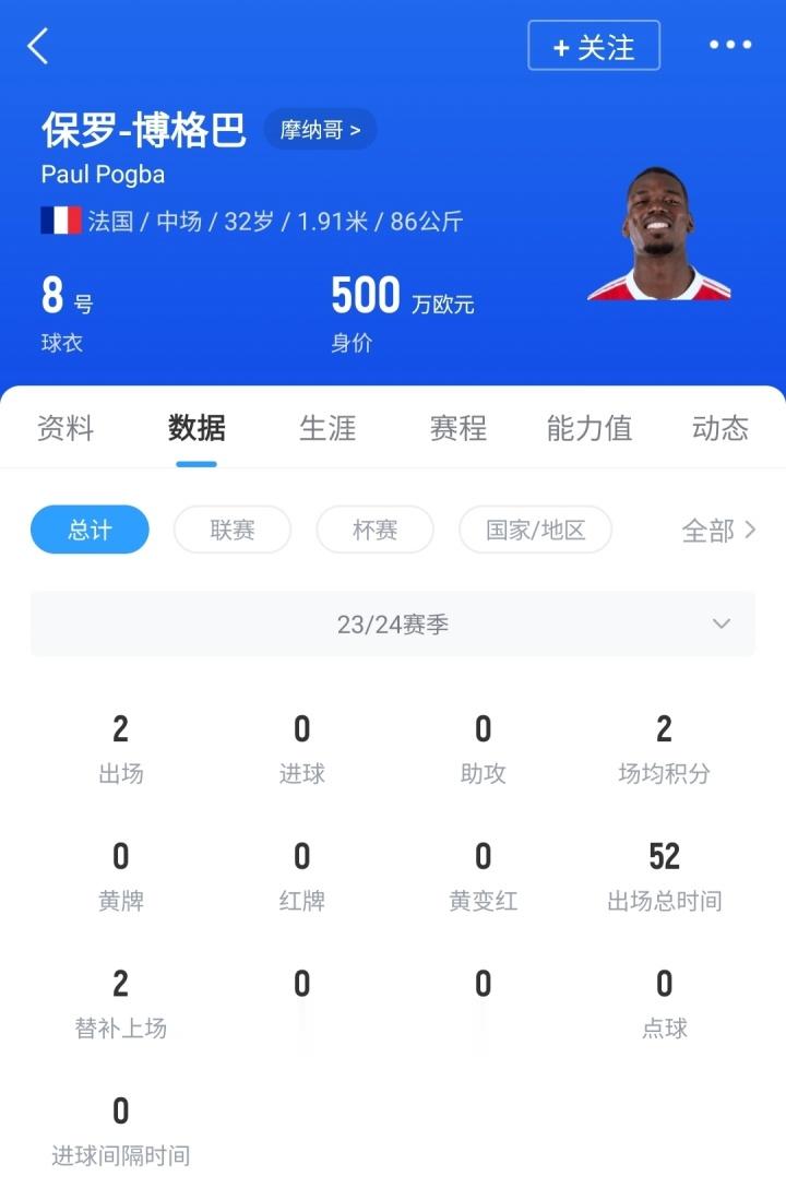 博格巴现年32岁,上半年结束禁赛的他以自由身与摩纳哥签约2年,目前身价仅剩500万欧。