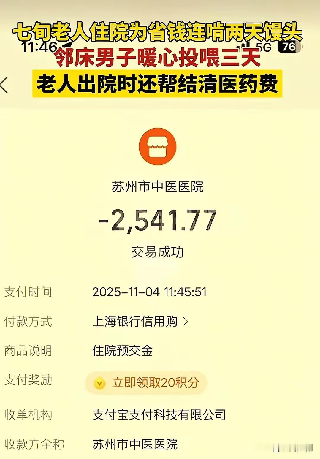 在医院的走廊上,一位古稀老人静静地躺在病床上,脸色惨白,双手紧紧攥着床单。为了节省每一分钱,他竟连续两日只以馒头果腹,连一顿有营养的饭菜都舍不得吃。这一幕让人看了心酸不已,也引得旁人纷纷心生怜悯。邻床的小伙子见老人这般艰难,心里满是不忍,便决定尽己所能帮帮他。 小伙子悄悄点了一份外卖,选了简单的粥和一些营养餐,随后谎称外卖送重了,是自己不小心多点了一份,把餐食放在了老人床边。老人看到有人给自己准备了吃的,眼眶泛红,嘴唇微微颤动,似有千言万语,却又难以启齿。小伙子轻声宽慰道:“老人家,您多吃点儿,身体才是本钱。”老人用微弱的声音回应着,眼中满是谢意。 这或许只是无数善举中的一个小细节,却让人真切感受到了人性的温暖。有人可能会说,给老人买几顿饭,自己心里会觉得满足,但面对高额的医药费,却也是有心无力。的确,医药费的负担常常压得许多家庭和个人喘不过气。善意的举动虽能温暖人心,却无法解决所有难题。 网友们纷纷留言:“给老人买几顿饭我能做到,但结清医药费,我实在没那个能力。”这话说出了很多人的心声。善意的帮助,或许只是短暂的慰藉,但对老人而言,却是一份难能可贵的关怀与陪伴。每一份善意,都如同一盏明灯,照亮了老人孤独的生活,也提醒着我们,在能力范围内,应伸出援手,传递关爱。 事实上,社会的温暖并非仅靠一次善举,更在于每个人的持续关注与实际行动。我们可以通过募捐、志愿服务、社区帮扶等途径,去帮助那些有需要的人。让他们明白,自己并非独自面对困境,社会的每个角落都有人在牵挂着他们。 在这个快节奏的时代,善良与关爱显得愈发珍贵。老人们的笑容或许朴实无华,却饱含着无尽的温情。我们每个人都能成为那束光,照亮他人的生命,让社会变得更加温暖、更有希望。善意的行为或许微不足道,但汇聚起来,便能形成一股强大的力量,温暖整个世界。
