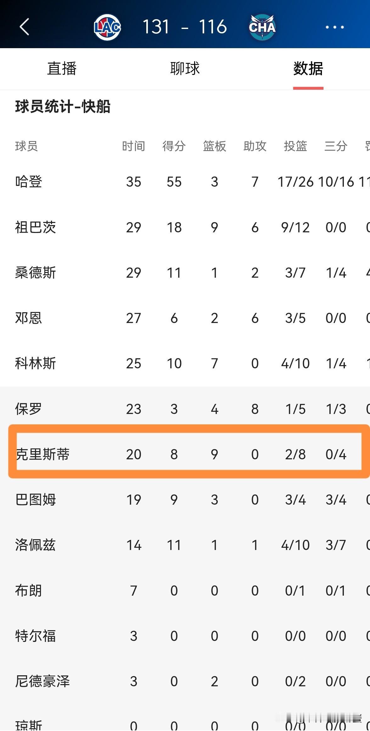 快船新星克里斯蒂真是太让人喜出望外了!在今天快船客场以131:116战胜黄蜂的比赛中,虽然克里斯蒂的投篮手感不佳,但是他在其他方面为球队提供了非常大的帮助。 整场比赛下来,克里斯蒂替补出战20分钟,投篮8中2,其中三分球4中0、罚球4中4得到8分9篮板1助攻,他的场上正负值为+7。 克里斯蒂最让人感到欣喜的地方在于他的拼劲,只要他在场上,他一定会在攻防两端拼尽全力。