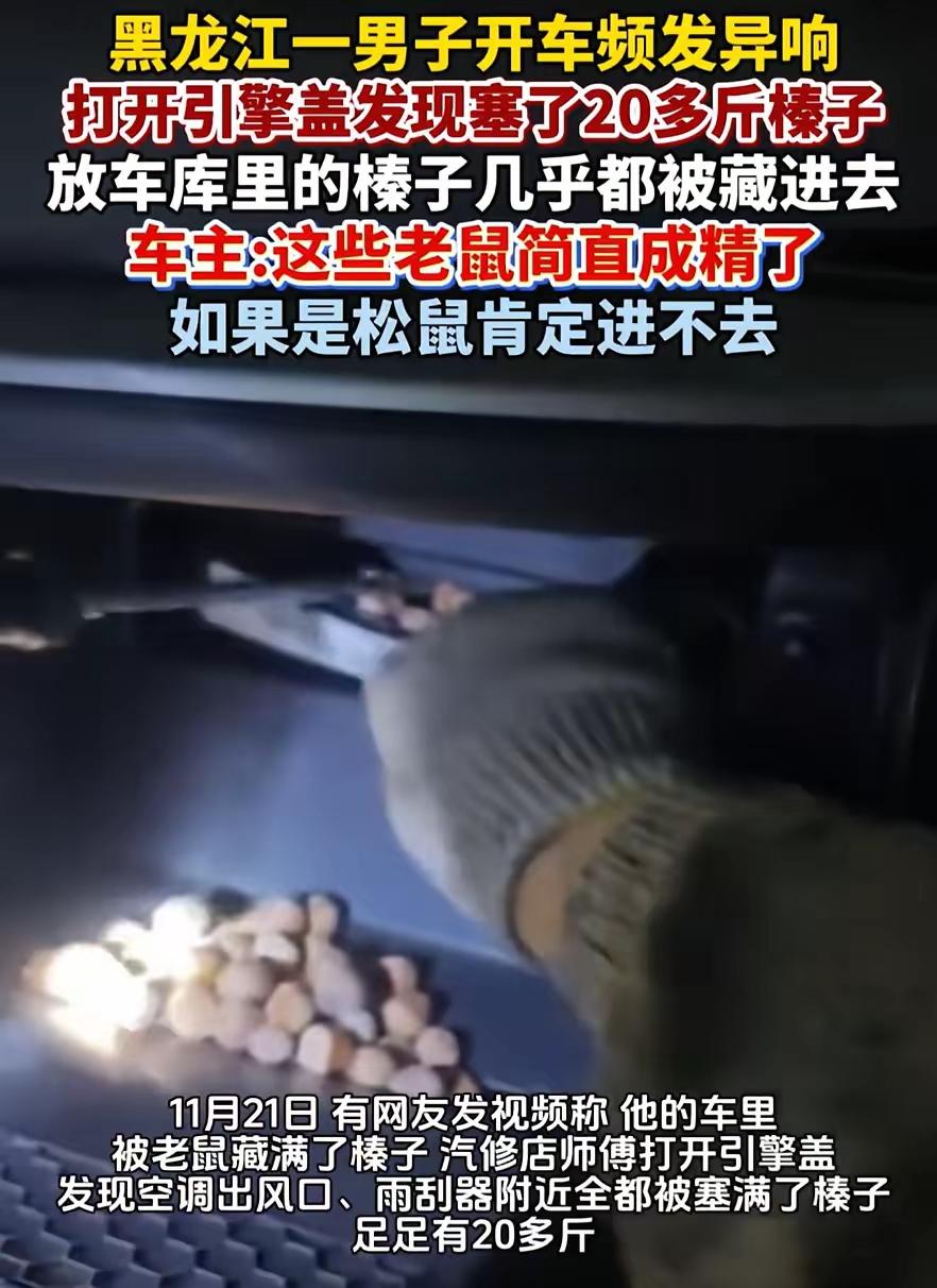“这下解释不清了!”黑龙江,一男子开车时发现车里有异响,总觉得不对劲,于是把车开到汽修店,没想到,工作人员把引擎盖打开后都傻眼了,哗啦哗啦的榛子从车里掉了出来,男子:这些老鼠简直成精了! 一个月前,王先生就觉车子不对劲。急刹或转弯时,引擎盖下总传来“窸窸窣窣”的动静,暖气也时好时坏,起初只当是老车小毛病,没往心里去。 直到最近异响越来越频繁,他才硬着头皮开去汽修店。师傅掀开引擎盖的瞬间,两人都傻了眼——空调出风口、雨刮器缝隙里,密密麻麻全是榛子。 一伸手清理,哗啦啦的榛子滚了一地,最后称重足足二十多斤。王先生这才猛然想起,前段时间存放在车库的榛子,原来是被这些“小偷”偷回了“家”。 这些老鼠倒精明,专挑发动机舱暖和隐蔽的角落筑巢储粮,把车子当成了过冬的“安乐窝”。王先生又气又笑,骂了句“简直成精了”。 秋冬季节,这类事并不少见。小动物怕冷,总爱钻发动机舱避寒,不仅会囤积食物,还可能咬断线路、损坏零件,埋下不小的安全隐患。 有网友留言:“我去年车被老鼠咬断刹车线,差点出大事!”也有人说:“难怪我车里总有坚果壳,原来是松鼠在搞鬼。” 这提醒我们,停车别靠草丛、垃圾堆,车库里的食物务必密封收好。看似不起眼的小动物,搞起破坏来可不含糊,车里有异响早检查,别等出问题才追悔莫及。