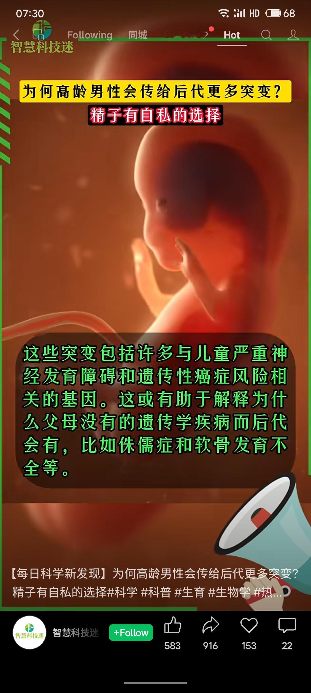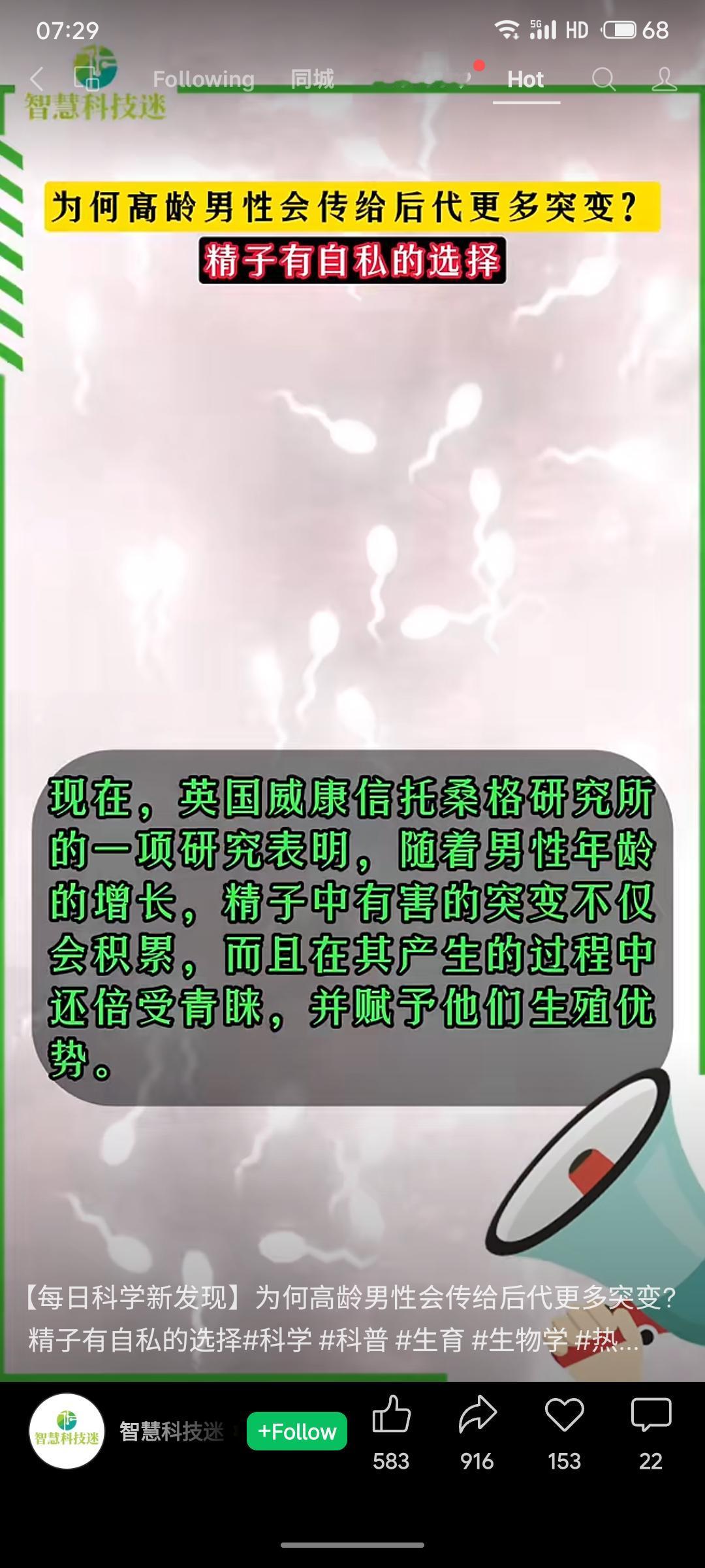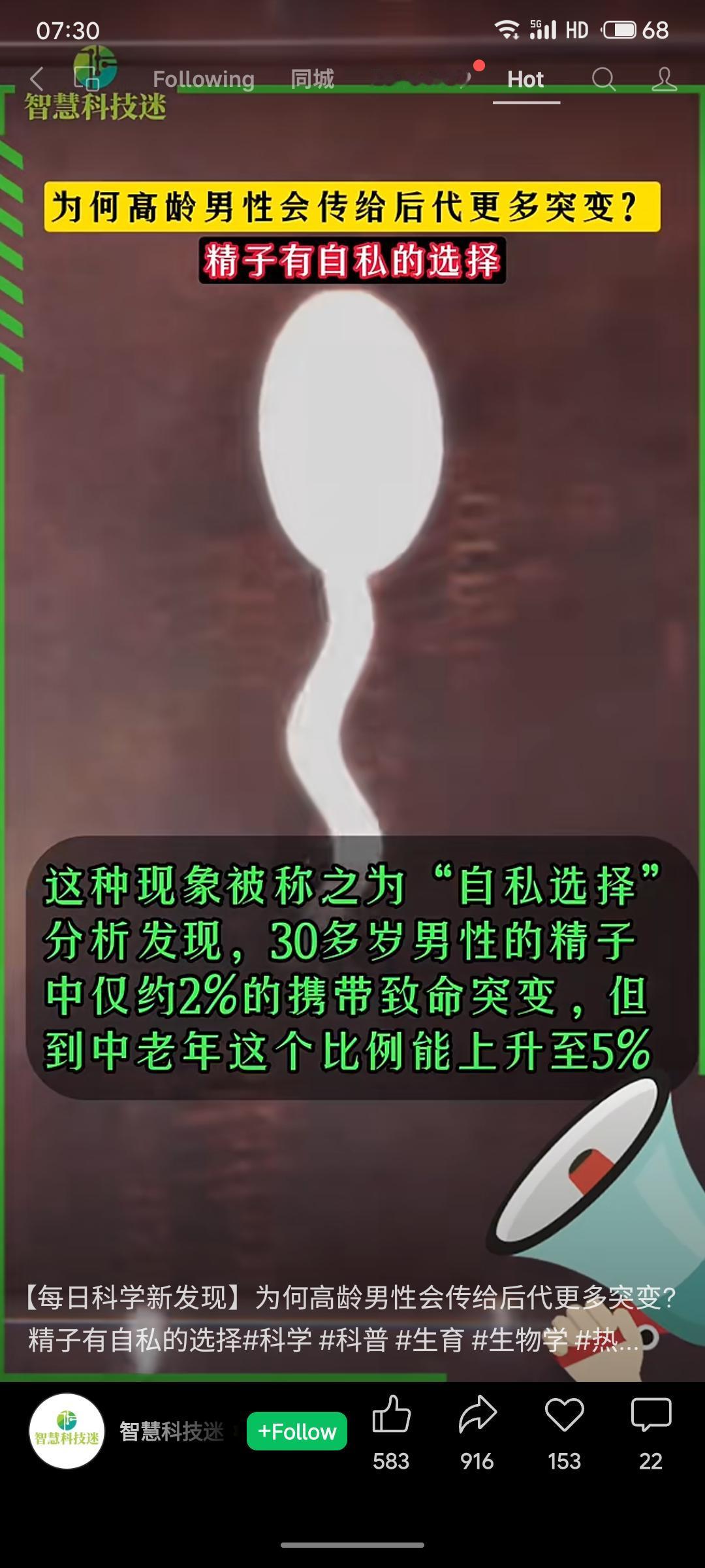 英国最新研究揭示,高龄父亲会将更多基因突变传给后代,原因是精子存在“自私选择”机制——随年龄增长,携带致命突变的精子反而更具生殖优势。30多岁男性精子中约2%含此类突变,中老年时比例可升至5%,这些突变与儿童神经发育障碍及遗传性癌症风险相关。研究还指出吸烟、饮酒和肥胖会进一步增加突变概率。