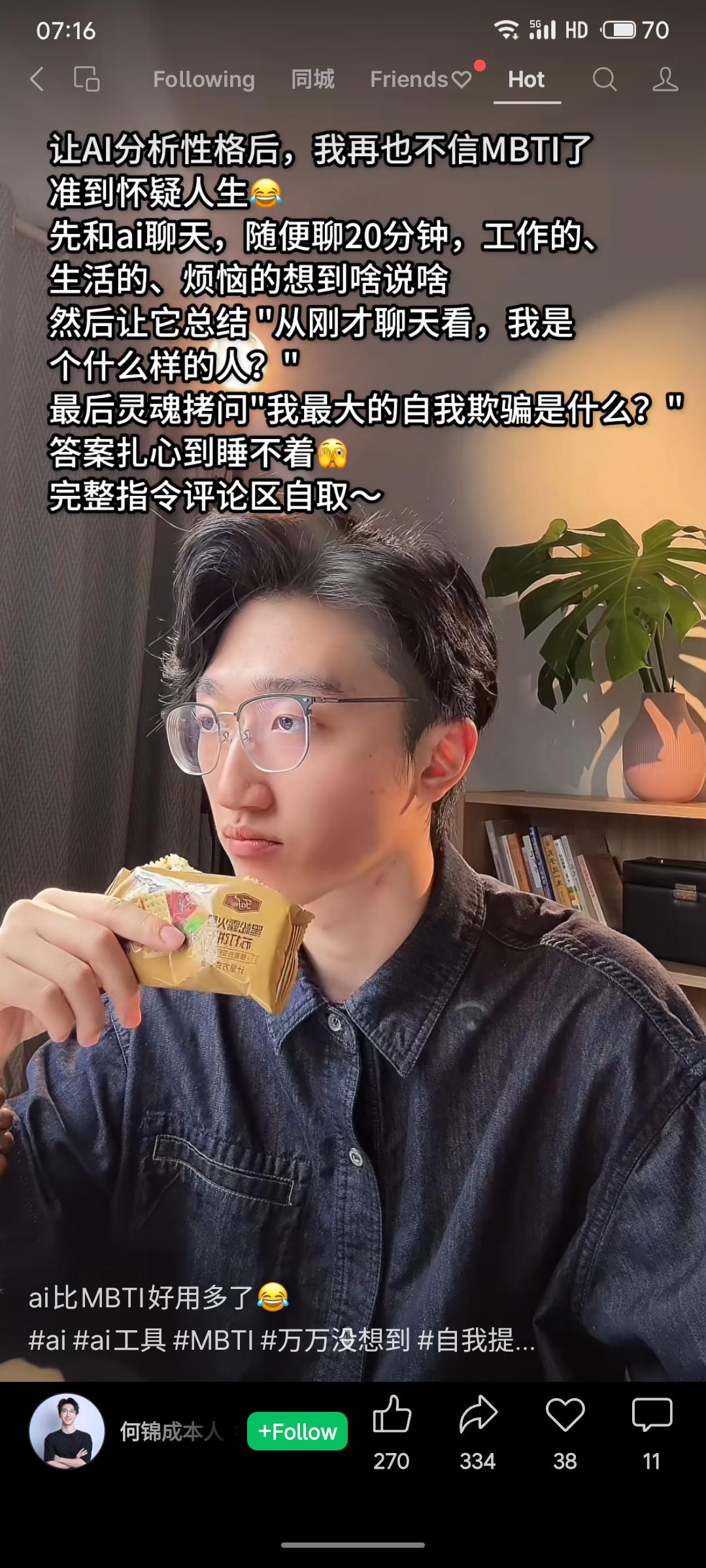 有人分享用AI分析性格的新方法:通过与AI聊天20分钟,让其总结个人特质并指出“最大的自我欺骗”,结果精准程度超越MBTI测试,引发热议。
