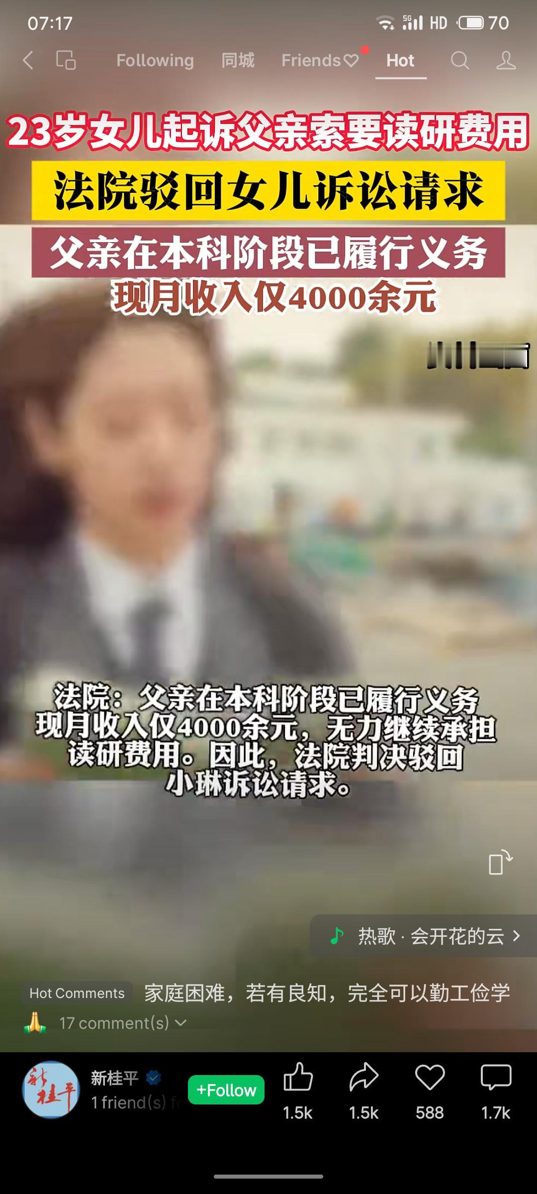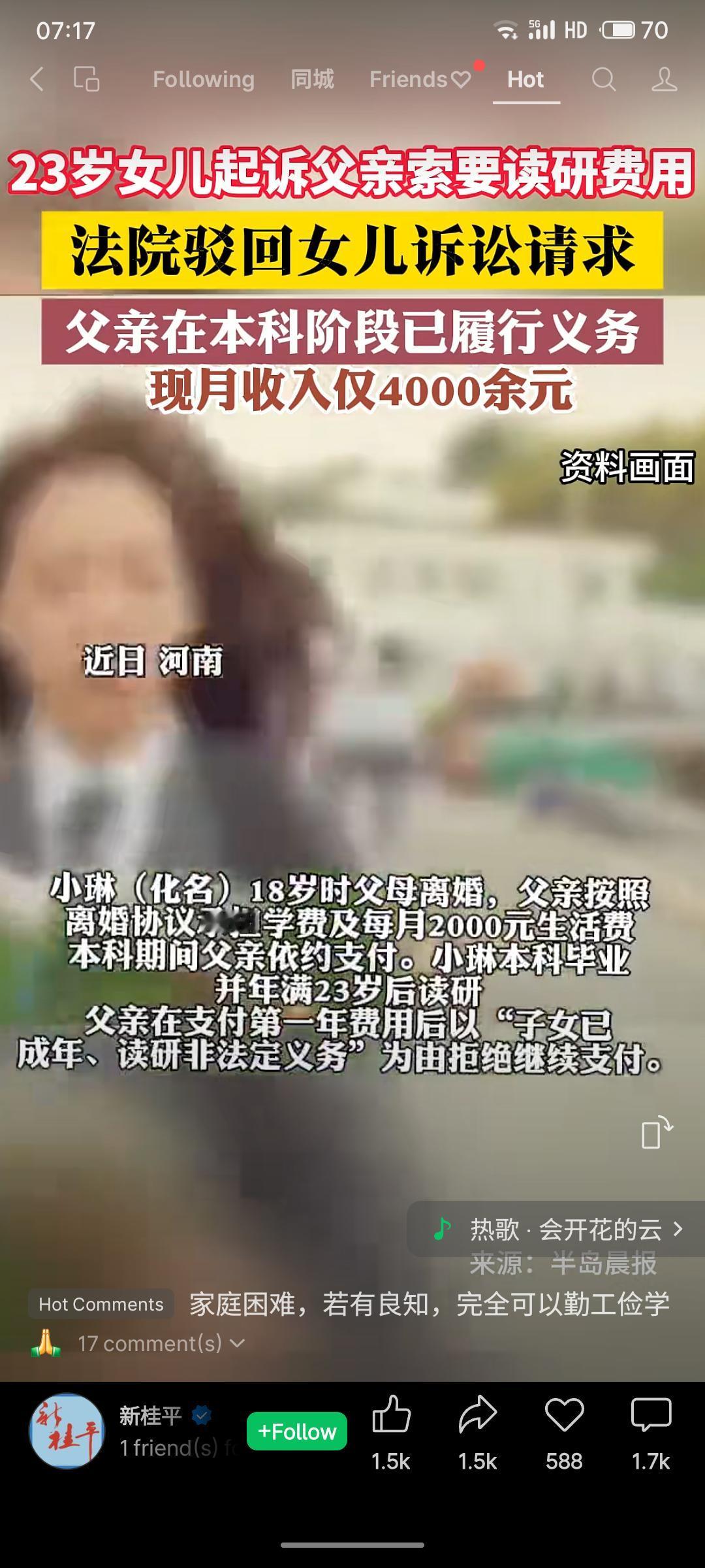 河南一23岁女儿起诉父亲索要读研费用,法院判决驳回。父亲在其本科阶段已依约支付学费及生活费,现月收入仅4000余元。法院认为子女读研并非父母法定义务,且父亲确无继续承担能力。