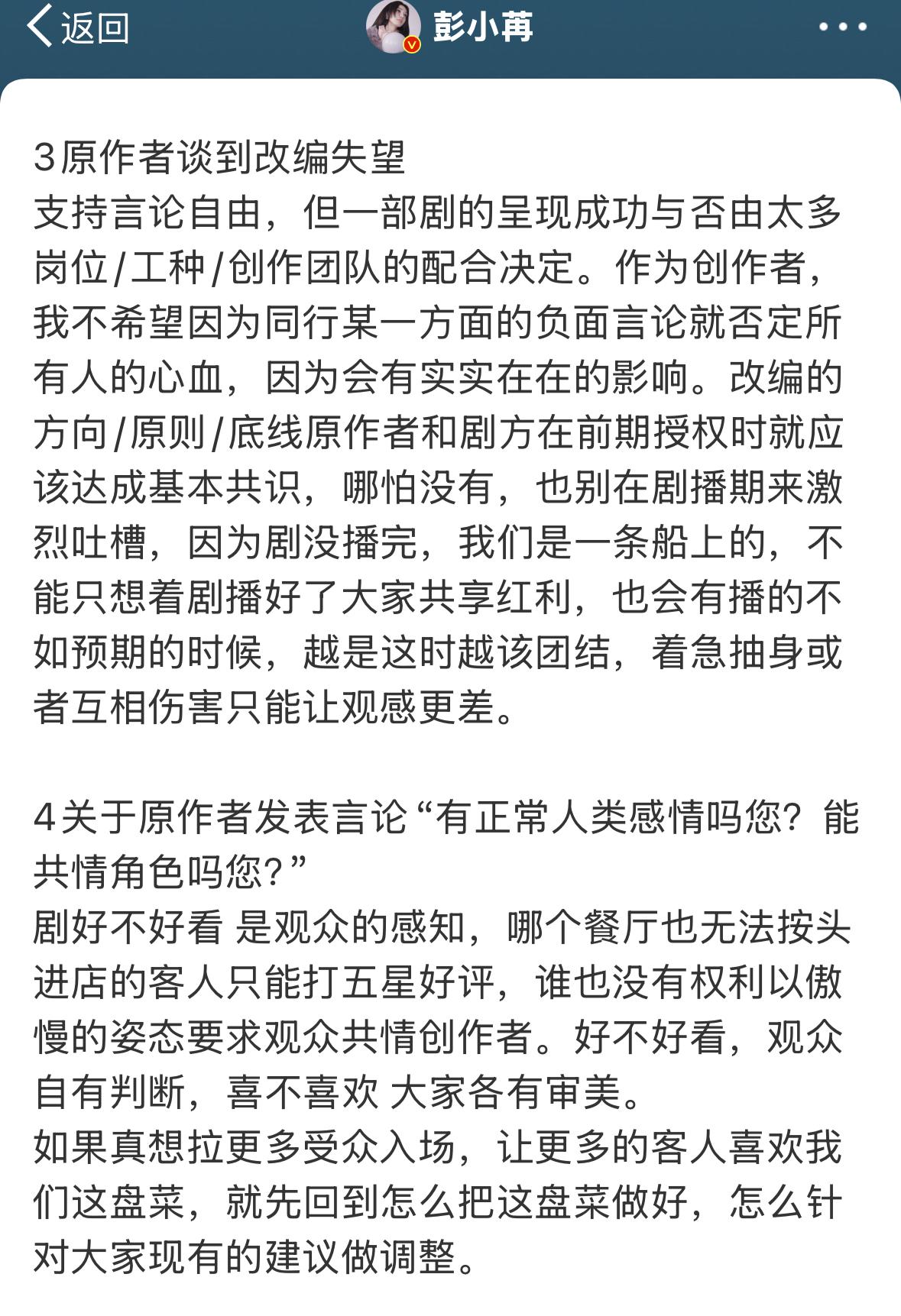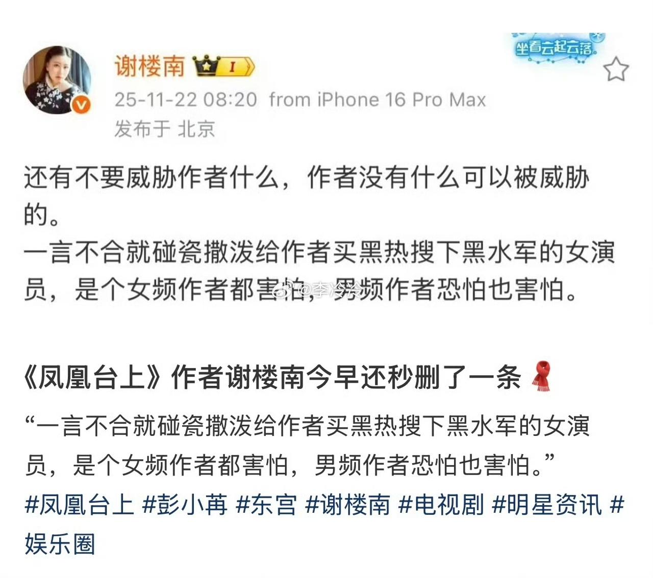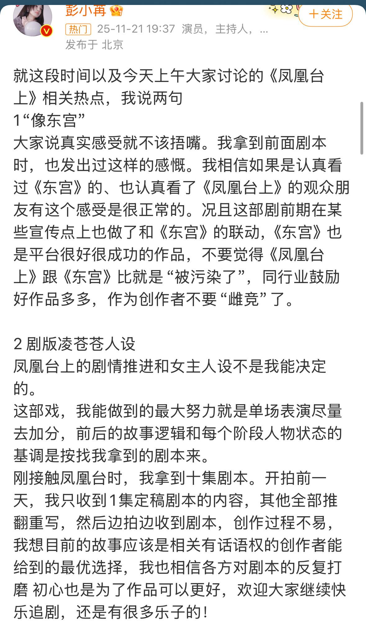 《凤凰台上》虽然播出数据不尽人意,但还轮不到原作者出来对主演说三道四博热度吧⁉️ 这样的剧本,说实话男女主都尽力了,你就是一个短剧的剧情,人家头部艺人愿意出演就是对原著最大的尊重了‼️还在那暗戳戳说人家与原著适配度不高,做个人吧‼️况且人家的回复,哪一条是针对你原作者了⁉️理解能力真差‼️ 我越看越感觉小说就是看了《东宫》后有感而写的吧‼️彭小冉适不适合,选角的时候怎么不说,不是就想借东宫女孩的噱头为剧播引流吗⁉️得了便宜还卖惨,不能既要又要吧‼️ 彭小苒 谢楼兰