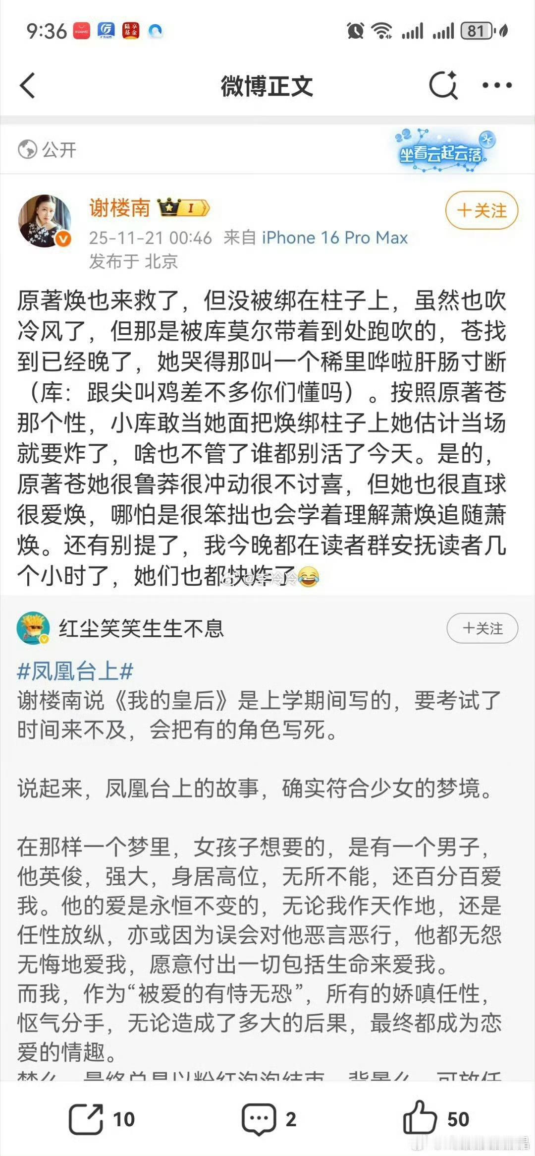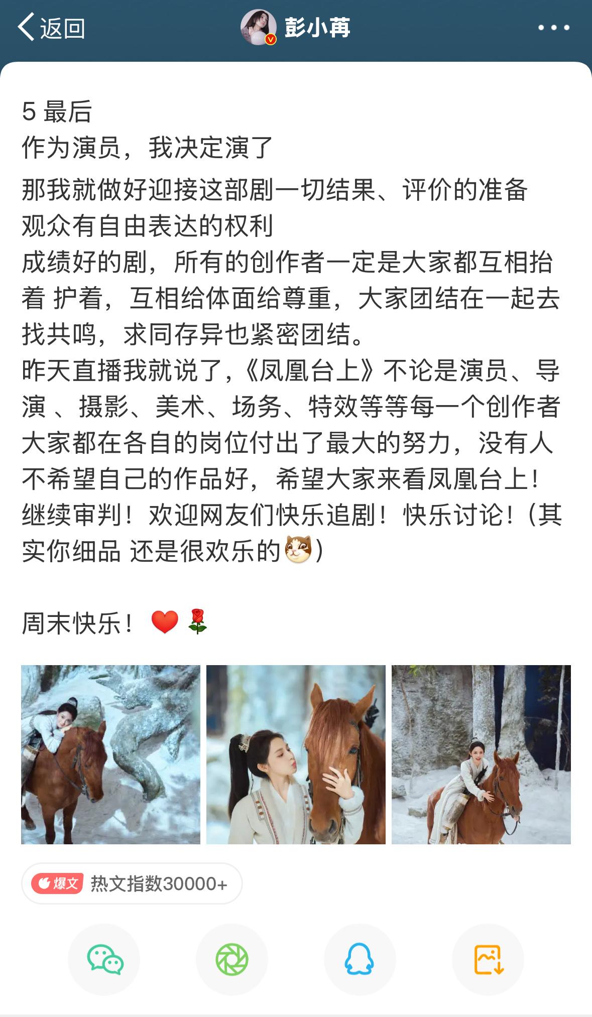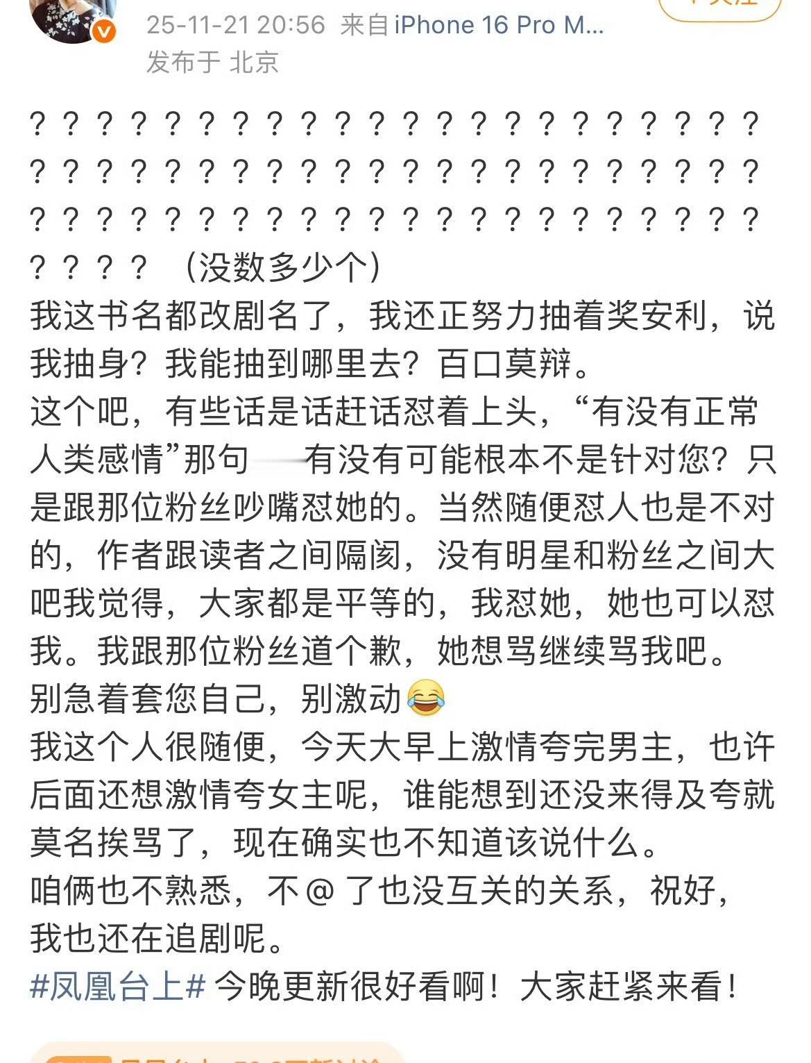 《凤凰台上》虽然播出数据不尽人意,但还轮不到原作者出来对主演说三道四博热度吧⁉️ 这样的剧本,说实话男女主都尽力了,你就是一个短剧的剧情,人家头部艺人愿意出演就是对原著最大的尊重了‼️还在那暗戳戳说人家与原著适配度不高,做个人吧‼️况且人家的回复,哪一条是针对你原作者了⁉️理解能力真差‼️ 我越看越感觉小说就是看了《东宫》后有感而写的吧‼️彭小冉适不适合,选角的时候怎么不说,不是就想借东宫女孩的噱头为剧播引流吗⁉️得了便宜还卖惨,不能既要又要吧‼️ 彭小苒 谢楼兰