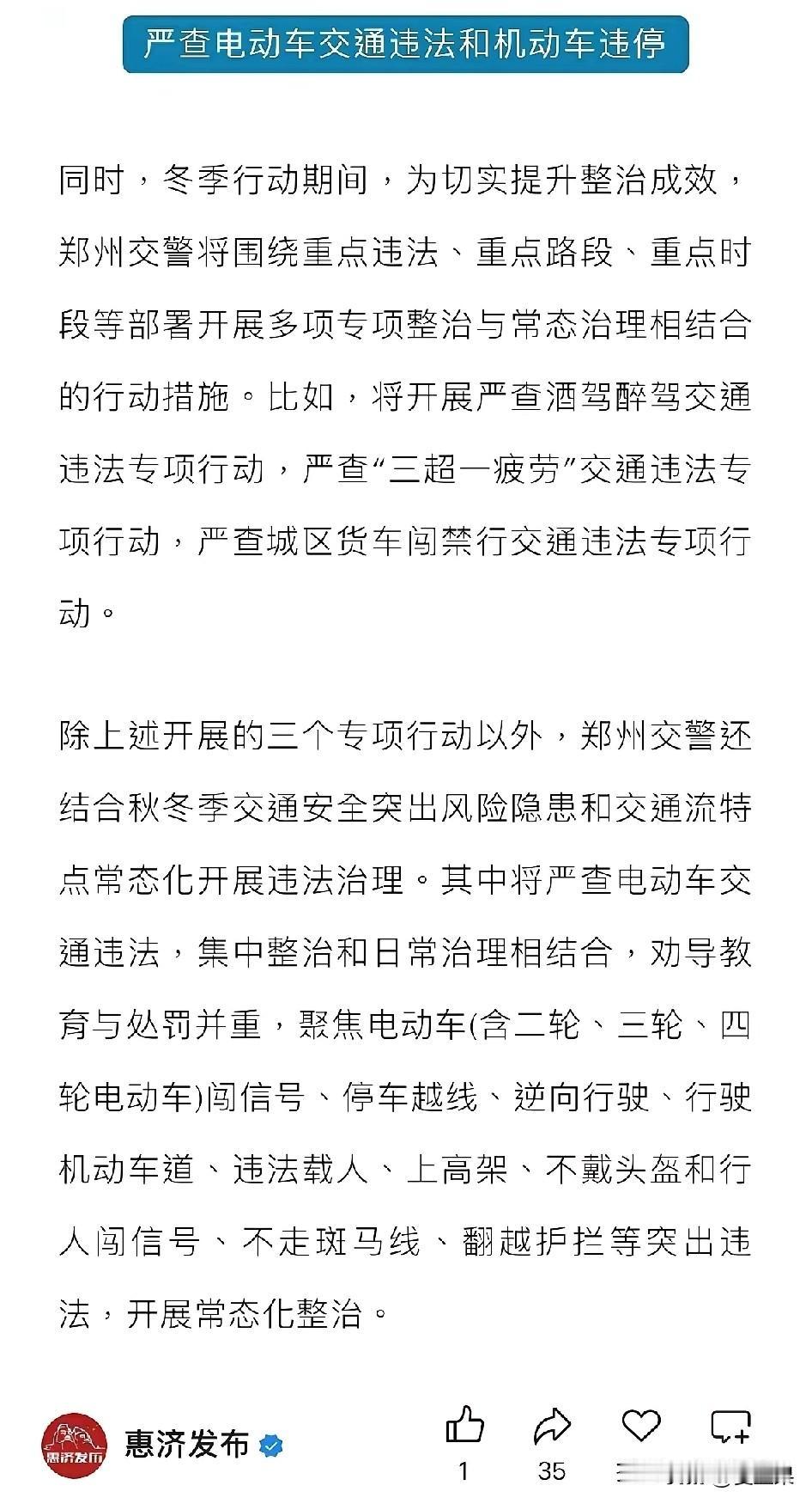 明天还能不能骑电三轮送孩子上学了? 这是个问题。 这几个月郑州的电动三轮如雨后春笋,猛然增多,终于让郑州的交警部门受不了了, 昨天发布通知,即日起对电三轮,电两轮,电四轮进行严格查处。 怎么查? 先是查经营,以后不让卖。 前两个月的电动三轮数据让人吃惊,平均一个门店,每天电三轮能卖出三四十辆,有的甚至一天卖了80多辆。 再是查上路,对违法行驶、停车的严肃查处。 这电三轮,夏天透风,因为有顶棚,太阳晒不着、雨淋不着,还不用穿雨衣;冬天保暖,侧棚一拉,冻不着。 但是它的缺点便是,一是后视镜有视野盲区,二是上路横行直撞,乱停乱放,因为不是机动车,只要能过管它红绿灯,在一些小区超市门口,乱停乱放;三是小区里充电占地方,有的小区两轮电车都够多了,充电挤不上,再加上三轮,充电更难。 所以,肯定要整治,但是如果真不让上路吧,老百姓肯定不愿意。毕竟这是一辆多么性价比高的交通工具啊。 以前骑两轮带两个孩子上学,你说载人违法,现在骑电三轮,送两三个孩子都有地方坐。 骑两轮下大雨的时候就是穿雨衣也视野不好,骑三轮就没有这个缺点。 对自己来说,支持骑三轮,可是看到骑三轮那么多乱象也觉得不整治也不行。