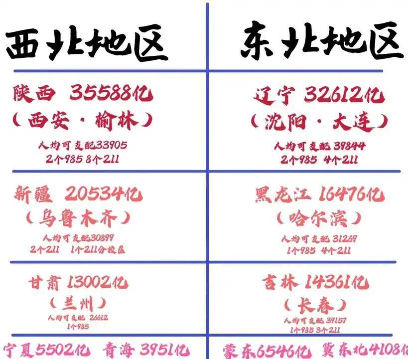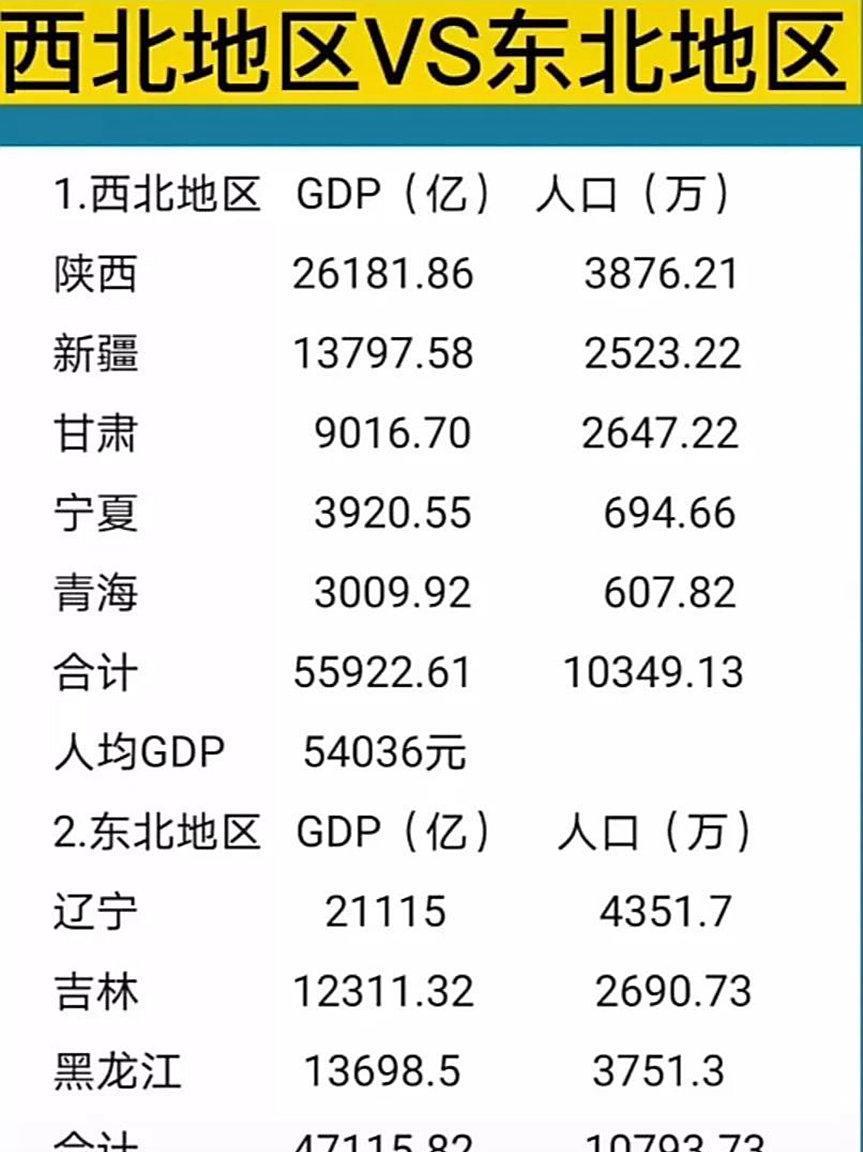 根据当前经济数据和区域发展趋势,未来5年西北GDP总量全面超越东北的可能性已成定局,在西北排第三的甘肃今年人均已经超越黑龙江,2027年能超过吉林。 一 经济总量对比 根据2025年上半年的经济数据,西北地区GDP总量已达到东北地区的92%,甘肃,宁夏,新疆,增速领跑全国,分别达到8.2% 7.9% 7.8% 远超全国平均水平的5.2%,核心驱动力能源化工产业爆发式增长。 西北F4(西安 榆林 乌鲁木齐 兰州)2025上半年对比东北F4(沈阳 大连 长春 哈尔滨)的92%,较2020年的75%,大幅提升。 二 东北落后西北的原因。 东北作为新中国的老工业核心,转型方面落后于西北,西北新能源和化工产业爆发式增长,而东北还在依赖传统工业。 人口红利,根据全国第七次人口普查,东北三省十年人口流失1000多万人口,而西北10年人口增长734万,一个地方的发展要靠人,没有人口怎么发展。 三 政策红利。 西北收益于 一带一路以及西部大开发国家对西部的全方位投资,而东北振新政策效果滞后。 未来5年,西北凭借能源优势,人口正增长以及政策倾斜,经济总量更一步的扩大。#东北GDP#