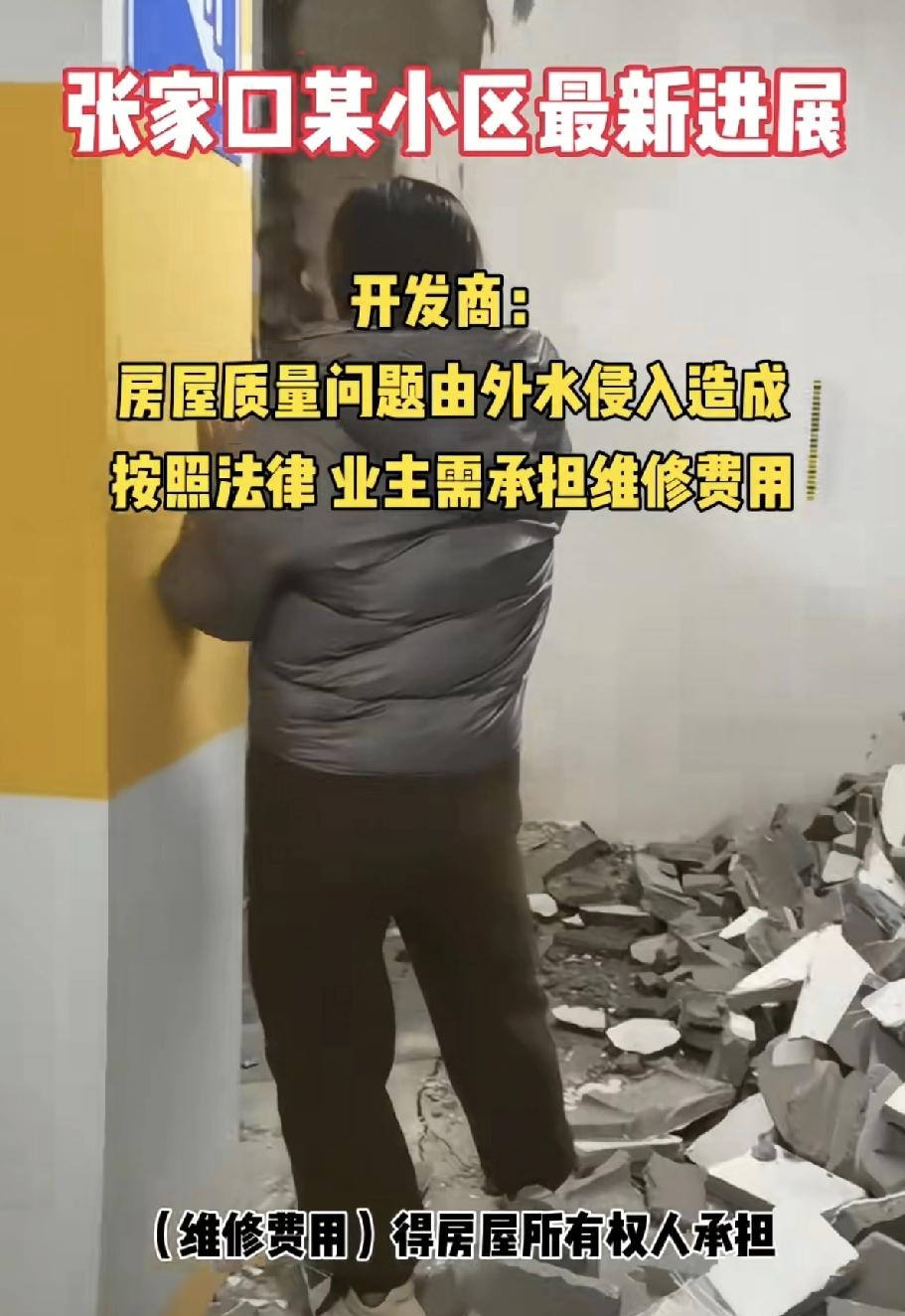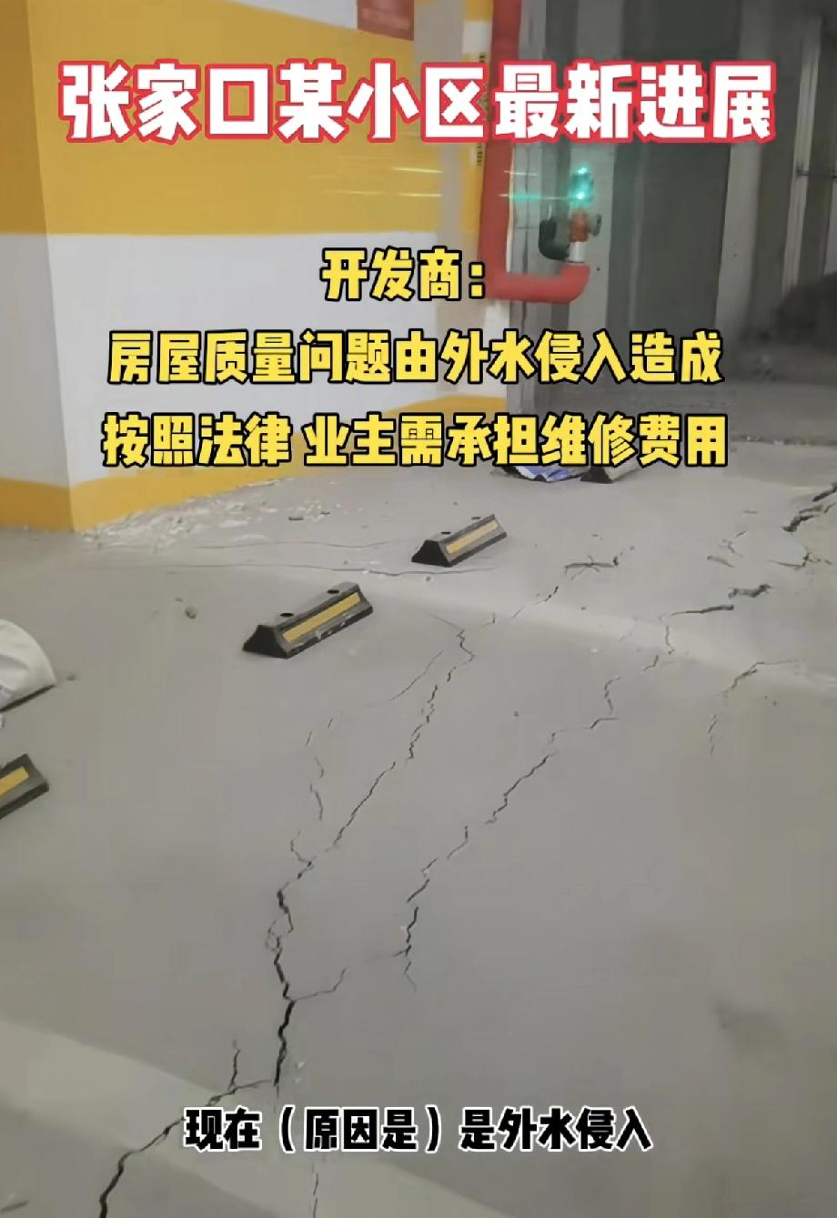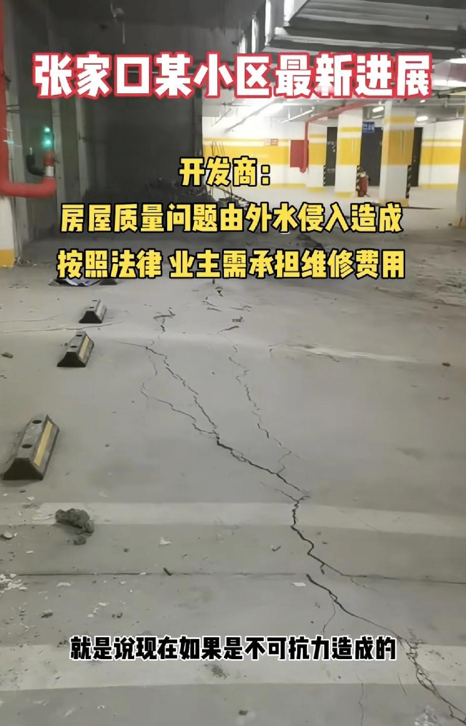 这小区的业主,这辈子都想不到,自己小区地下室地面裂开了,需要业主出钱维修吧! 没想到能被这个开发商坑成这样,很明显的房屋质量问题,偏偏给推到不可抗力上,楼下面水多了,排不出去,给地面拱裂纹了,就是不可抗力? 那水为什么排不出去啊,楼在设计和建筑的时候,为什么想不到这个问题呢? 一切让业主承担,怎么能让人接受呢! 大家觉得呢?