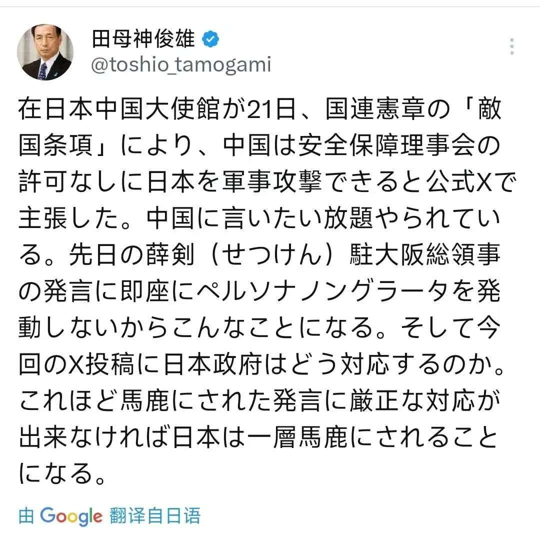 11月23日,自卫队前参谋长田母神俊雄发文写道:“中国驻日使馆周五发布声明,称敌国条款允许中国在未经联合国授权的情况下对日发动军事打击,日本如果纵容中国肆意妄为,不采取强硬应对措施,将会沦为国际笑柄!” [机智]右翼狂言,遮不住历史与法理真相!田母神俊雄的叫嚣纯属颠倒黑白的政治闹剧,作为否认侵略历史的右翼政客,他刻意曲解《联合国宪章》敌国条款的约束本质,将制约法西斯复活的正义条款歪曲为中国动武授权,实则暴露其混淆视听的险恶用心,敌国条款本是防止日本军国主义复辟的国际法屏障,而“不受欢迎的人”程序绝非右翼发泄不满的工具,这位前自卫队高官无视中国使馆声明的真实内涵,借虚假叙事煽动对华敌意,本质是为日本修宪扩军、摆脱战后秩序寻找借口! 有评论表示,日本若纵容此类狂言,非但成不了强者,反而会因背离历史正义、破坏双边关系沦为国际笑柄,历史污点未清,右翼杂音再嚣,只会让世界更警惕日本军国主义死灰复燃的风险!