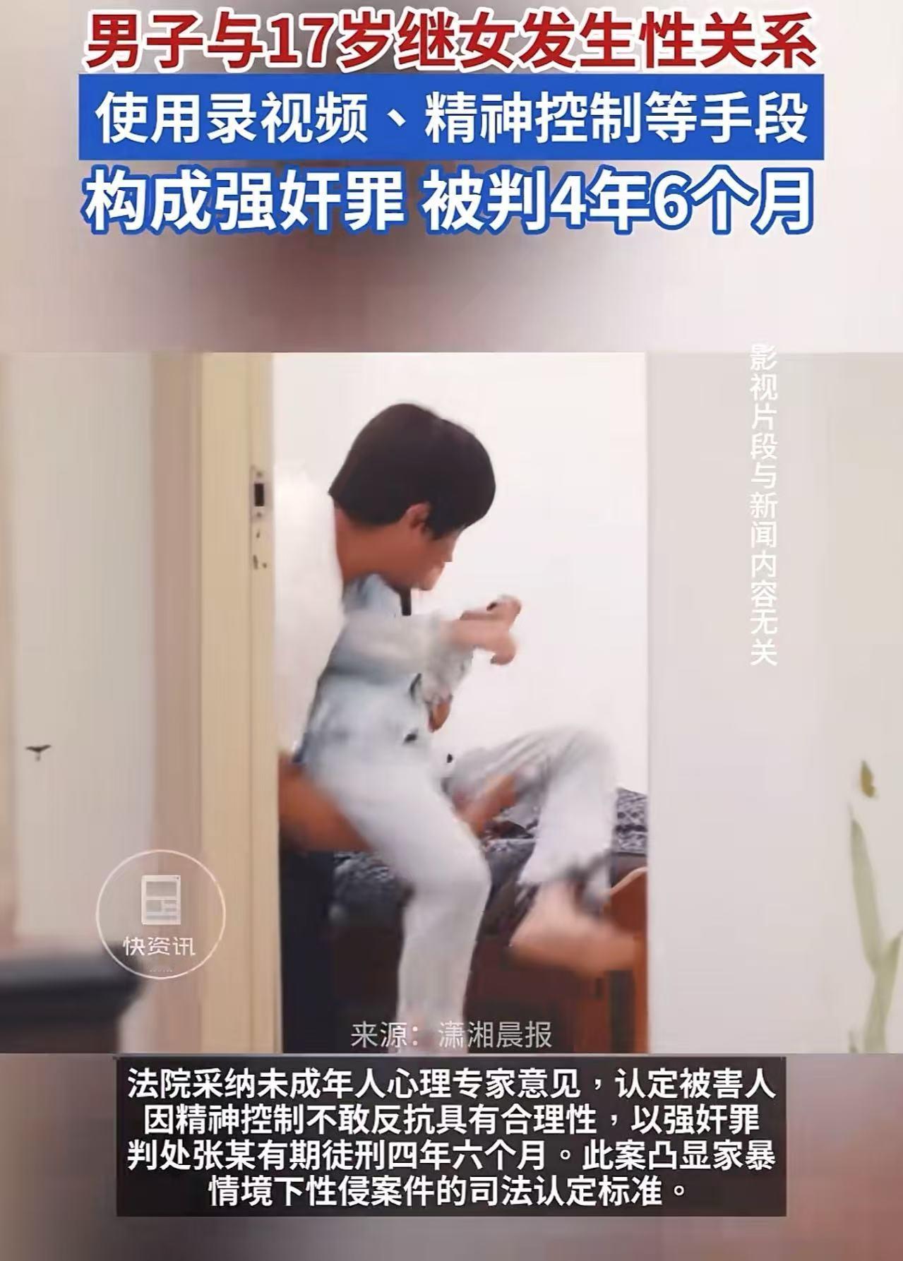 男子与17岁继女发生性关系并录视频,继女向母亲求助,母亲报案 。但男子辩称自己没有使用暴力,继女也非常配合,她是自愿的!之所以报案,是因为自己家暴她母亲对自己报复!但法院却认定为强奸,判决男子 4 年 6 个月!网友:所以说,有小孩的夫妻尽量别离婚,就算真的离婚了,女儿尽量跟父亲! (来源:潇湘晨报) 2022年7月,母亲改嫁后,17 岁的小吴来到某市与母亲以及继父张某等人共同生活。 在日常相处中,吴小某从母亲口中得知张某长期对她实施家庭暴力,更亲眼目睹了母亲遭受暴力时的惨状,那一张张因伤痛而扭曲的脸,那一道道触目惊心的伤痕,让她对张某充满了恐惧与厌恶。 2022年10月5日晚上,家里又爆发了激烈的争吵。妈妈和张某吵得不可开交,最后妈妈吓得离家出走,连家都不敢回。 而在这期间,张某为了进一步威慑小吴,竟然恶狠狠地告诉小吴,自己曾经因故意杀人被判刑。 那阴森的语气、冰冷的眼神,让小吴仿佛置身于无尽的黑暗之中,全身的血液都仿佛凝固了。 当晚22时许,张某露出了他那丑恶的真面目,强行与吴小某发生了性关系。 更令人发指的是,在实施这一罪恶行径的过程中,张某竟然还用手机录制了视频,妄图以此进一步控制小吴。 遭受如此屈辱与伤害的小吴,在绝望中用手机发消息向母亲求救。 母亲看到消息后,心急如焚,毫不犹豫地选择了报警。 张某察觉到事情败露,妄图逃跑,然而天网恢恢,疏而不漏,他最终在出租房内被公安人员成功抓获。 但张某却辩称小吴是自愿的!而办案人员在小吴身上确实没有找到什么伤痕。 而小吴却称,自己是因为害怕才不敢反抗…… 为了查明真相,检察机关展现出了高度的专业素养和严谨态度,他们申请了在未成年人心理方面有着专门知识的人,就案涉视频中吴小某的行为出具分析报告。 法院经过慎重考虑,准许了这一申请,并通知有专门知识的人出庭质证,以确保案件审理的公正性和准确性。 经过严谨的审查和质证,法院最终作出了生效裁判。法院认为,吴小某由于知晓张某曾因故意杀人被判刑,并且多次目睹张某对母亲实施家暴,内心深处对张某充满了极度的惧怕。 在这种恐惧的心理状态下,她在被性侵时未予反抗,这一行为具有充分的合理性,完全符合家暴情境下被害人的心理和生理特征。 最后,法院判决张某通过精神控制等恶劣手段,让小吴陷入不敢反抗的境地,进而与她发生性关系的行为,已经构成了强奸罪。最终,张某被依法判处有期徒刑四年六个月。 此事引发热议, 有网友说,太轻了:第一:有前科,加重;第二:女娃未满十八岁,加重;第三,是继女,有违人伦,加重。 也有网友说,我也有女儿,年轻时候跟孩子的爹总吵架,我一直有离婚的想法,但是没敢行动,怕有一天发生的事,搬石砸天都不赶趟。还好忍忍一切都过去了,现在挺好。 还有网友说,既然没有暴力,怎么会是强奸?不能只听一面之词啊? 其实,强奸通常指在违背被害人意愿的前提下,使用暴力、胁迫或其他手段强行与被害人进行性交的行为。而这里,张某就是使用了胁迫的手段! 沉默不是同意,恐惧下的“不反抗”就是最无声的反抗。我们不能用普通的眼光去看待家暴情境下的受害者,更不能因为她们没有激烈反抗就否定她们的受害事实。 张某的恶行,不仅是对小吴身体和心灵的严重摧残,更是对社会公序良俗和法律尊严的公然践踏。 这起案件不仅仅是一个简单的强奸罪判决,它更像是一面镜子,清晰地映照出家庭暴力对家庭成员,尤其是未成年人造成的深远伤害。 家庭本应是温暖的港湾,是给予人安全感和关爱的地方,然而在一些像张某这样的人手中,却变成了实施暴力和犯罪的场所。 我们必须深刻反思,如何才能更好地保护那些在家庭暴力阴影下生活的弱势群体,如何才能让法律的光芒照亮每一个黑暗的角落,让类似的悲剧不再上演!