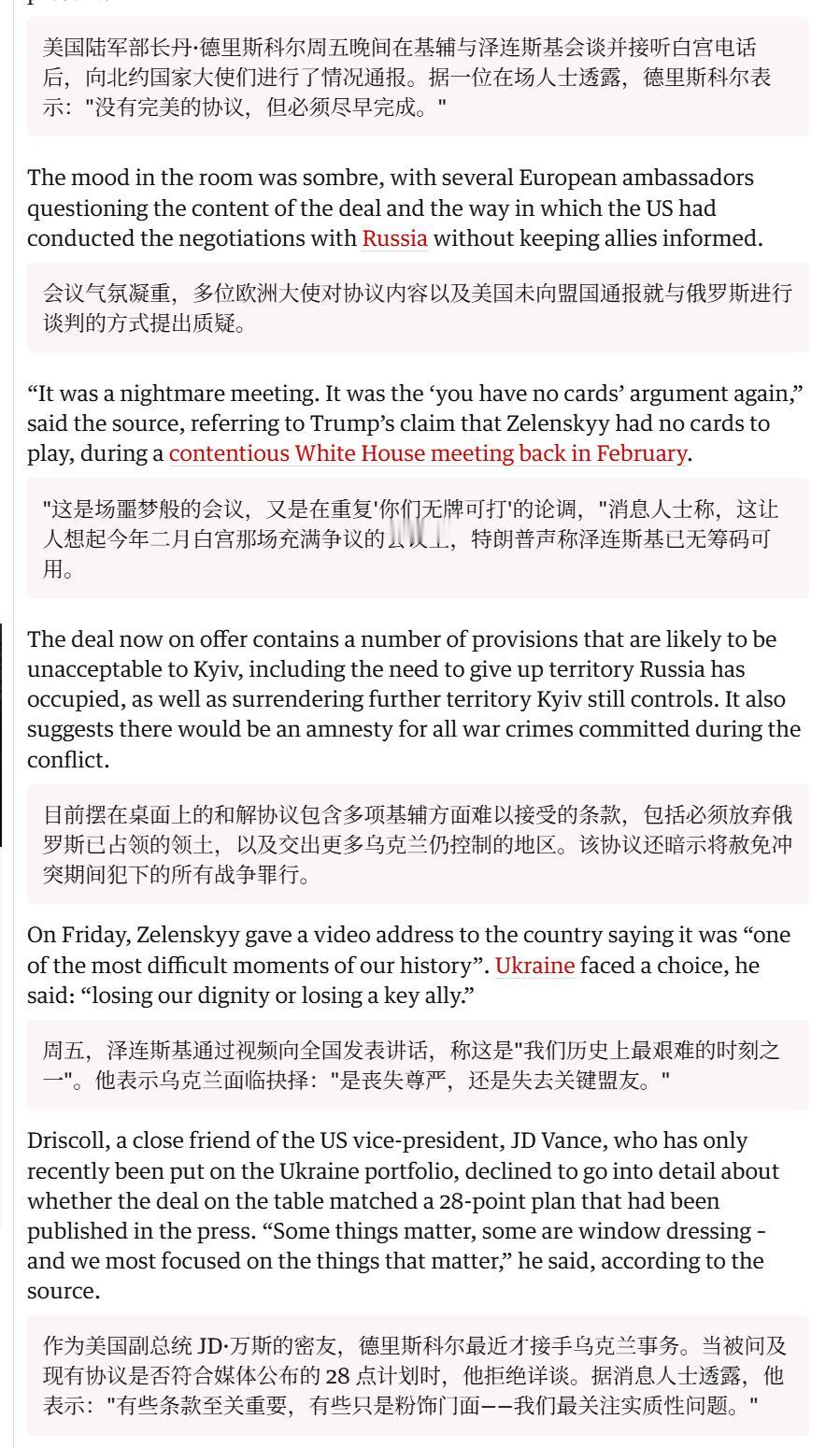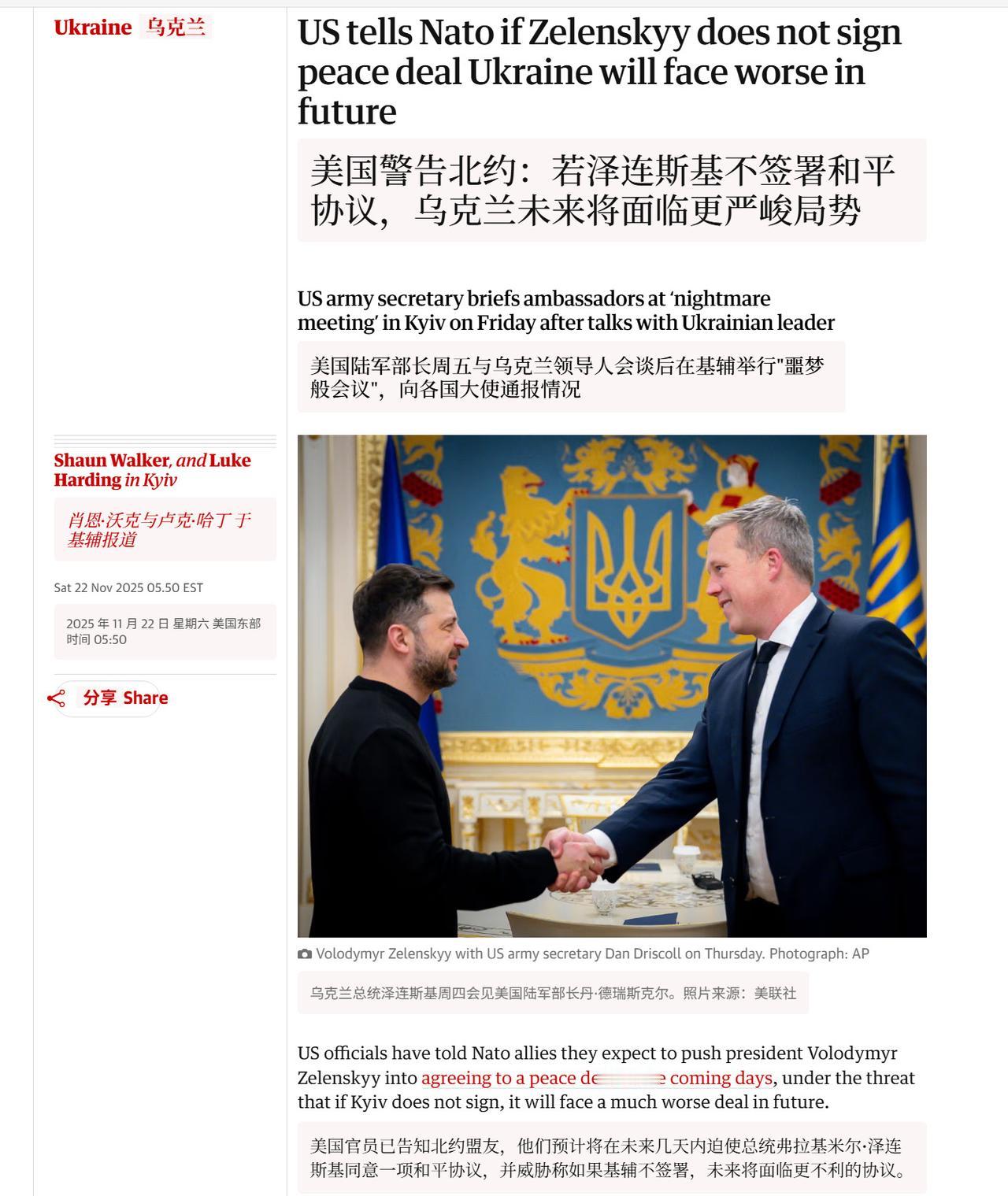 美国陆军部长德里斯科尔最近通过北约渠道向乌克兰发出了直白警告。他告诉泽连斯基,如果拒绝特朗普的和平计划,未来将面临"更严峻局势"。 德里斯科尔强调必须尽快达成协议,否则基辅将来可能被迫接受更不利的条件。特朗普设定的最后期限就在四天后——11月27日。泽连斯基坦言,这是乌克兰"历史上最艰难的时刻之一"。 这份引发争议的和平计划包含多项苛刻条款。它要求乌克兰承认俄罗斯对克里米亚和顿巴斯地区的实际控制,还要设立非军事缓冲区。在北约问题上,草案规定乌克兰必须承诺永不加入,同时限制境内军事部署规模,以此换取所谓的"安全保障"。 经济条款同样引人关注。美国提议将被冻结的约一千亿美元俄罗斯资产用于乌克兰重建,但要求由美方主导项目并分走一半利润。此外,美俄还计划合作开发乌克兰的天然气和稀土资源。 特朗普政府采取了强硬施压策略。总统本人公开宣称泽连斯基"无牌可打",警告如果不接受计划"冲突将继续",甚至暗示乌克兰可能"不复存在"。德里斯科尔则通过北约渠道进一步施压,声称拖延只会让基辅未来面临更糟糕的条件。 面对压力,泽连斯基没有直接拒绝计划,但强调"不会背叛国家利益",正在寻求与欧美协商替代方案。他坚持将主权与安全作为底线,并计划与特朗普通电话紧急磋商。 欧洲国家对此事表现出警惕和不满。德国、英国等欧盟成员国透露,他们未被提前征询方案细节。德国外长坦言"未收到通报",欧盟官员更批评特朗普特使"推动俄方利益",质疑美国单方面牺牲乌克兰。 俄罗斯方面则显得较为低调。俄总统新闻秘书佩斯科夫承认俄美保持接触,但否认就方案内容与美国进行磋商。 值得注意的是,草案规定将由特朗普领导的"国际和平委员会"监督协议执行,这被质疑将赋予美国对乌克兰政治进程的长期干预权,可能削弱该国的独立决策能力。 当前局势的核心矛盾在于:美国以"尽快停火"为由,迫使乌克兰在领土与主权上做出重大让步,而欧洲盟友被排除在协商过程之外,暴露了西方阵营的内部分裂。未来四天内泽连斯基的决定,很可能将重塑整个东欧的安全格局。