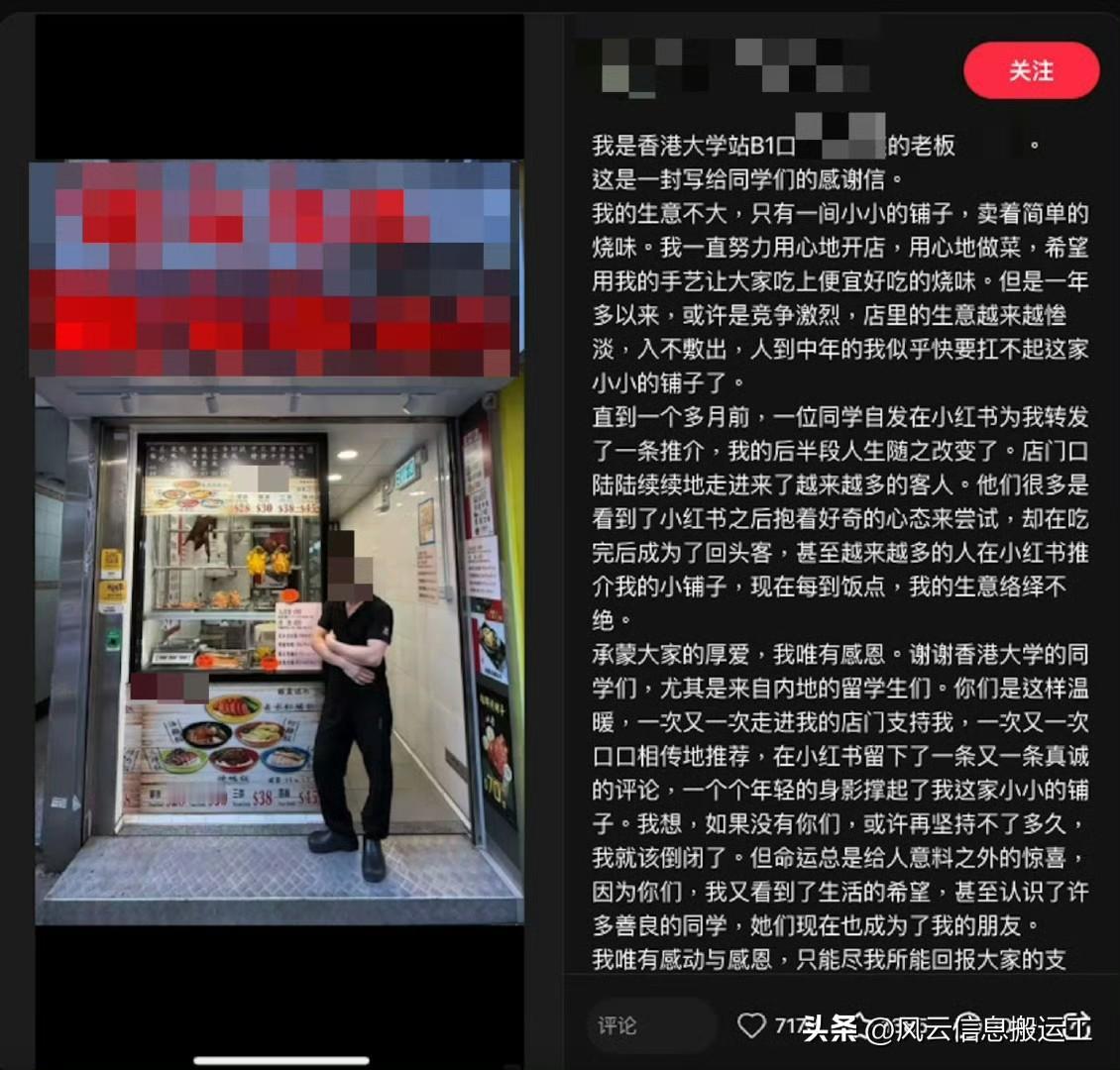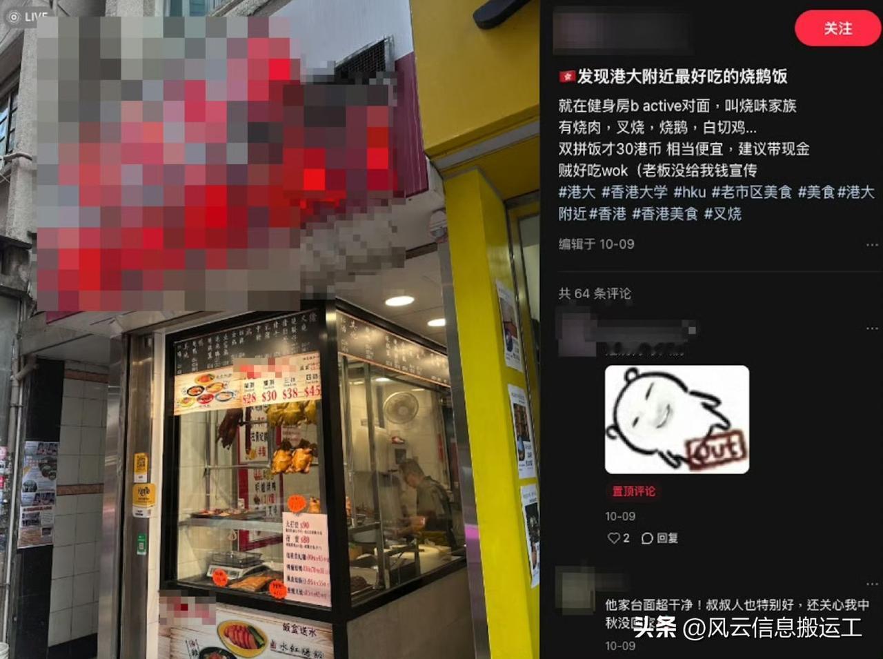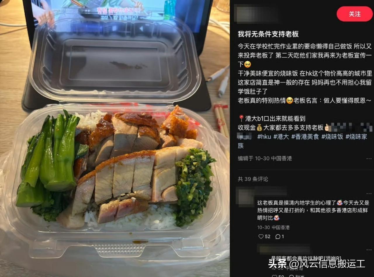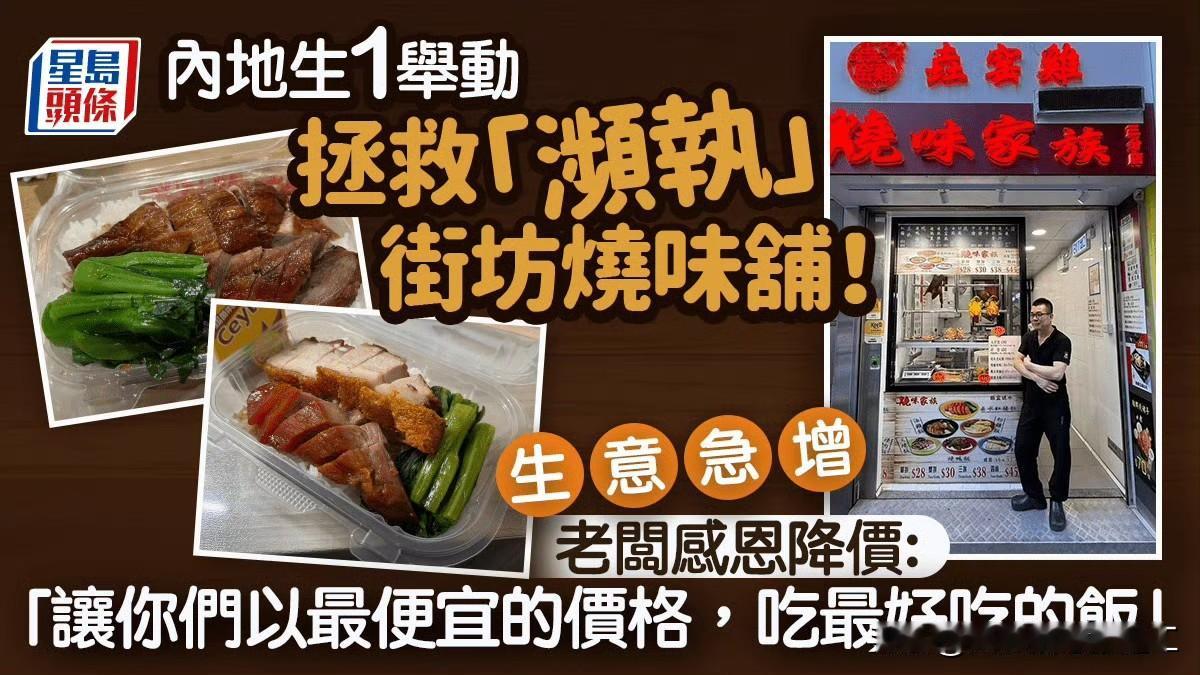 香港薄扶林一家烧味店,烧味单拼饭$28,而双拼饭及三拼饭分别是$30及$38,如此经济的费用,但一年多来生意惨淡,甚至濒临倒闭。 然而,一位港大的学生经过,吃了饭之后赞不绝口,发帖上小红书,从此,这家店生意爆红,看到帖子来帮衬的人越来越多。