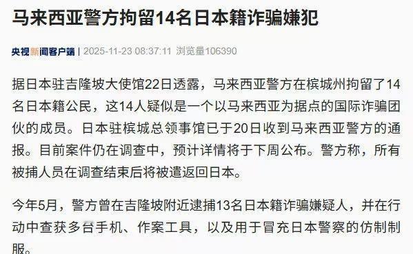 【马来西亚警方拘留14名日本籍诈骗嫌犯】 经济观察网 据央视新闻客户端消息,据日