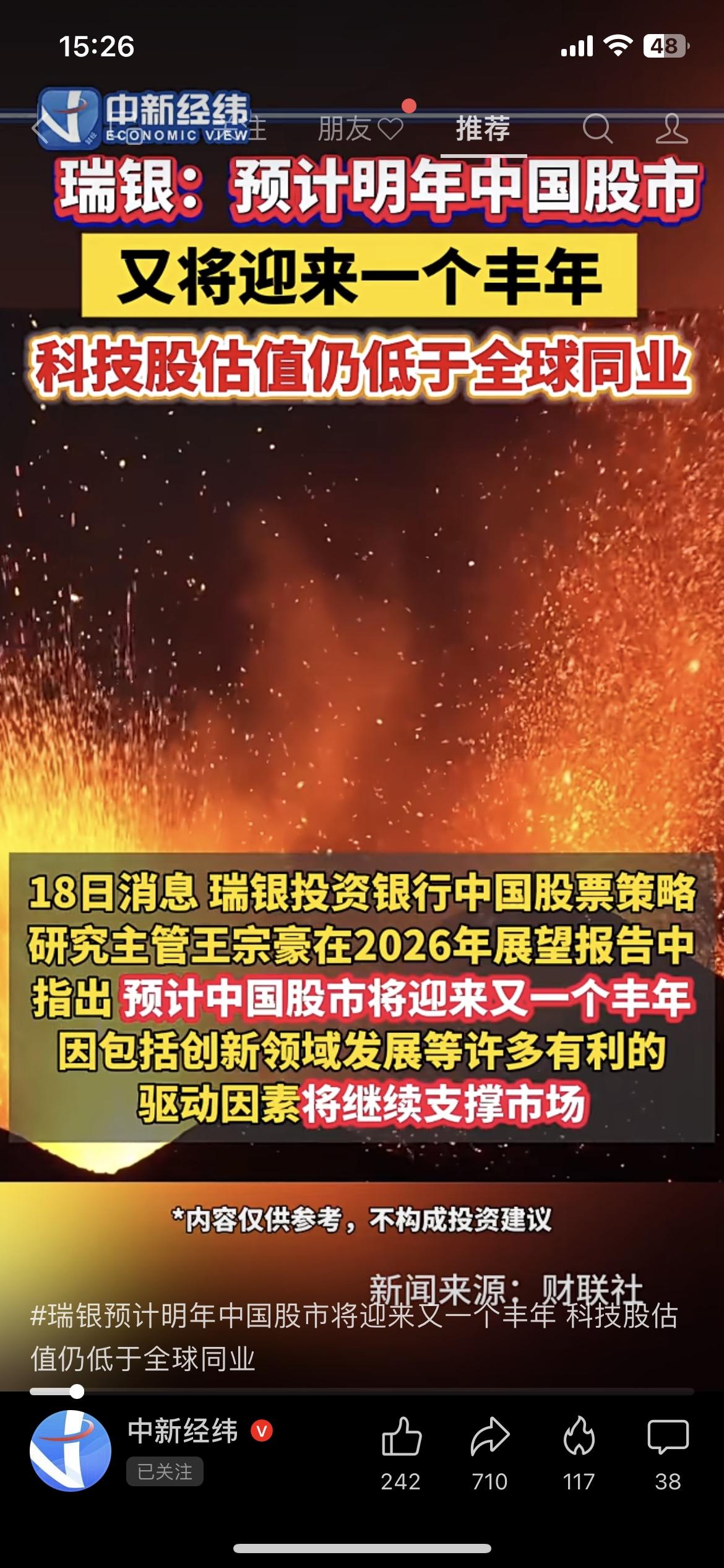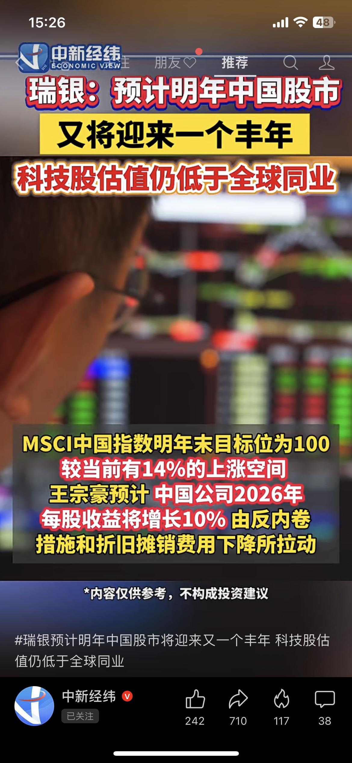 明年A股是丰年”!瑞银喊出14%涨幅,科技股要起飞?但有个细节得注意… 刚被美股暴跌整得心慌,瑞银突然给A股泼了盆“热水”: • 说明年中国股市是“丰年”,MSCI中国指数能涨14%; • 科技股估值比全球低,反内卷政策还能拉业绩; • 甚至说2026年A股公司利润能涨10%。 但评论区瞬间清醒:“去年机构也说‘牛市要来了’,结果我套到现在”“估值低是真的,但涨不涨得看资金买不买账啊”。 机构的“好话”听听就行,真要进场,你觉得现在是机会吗?