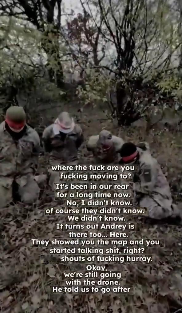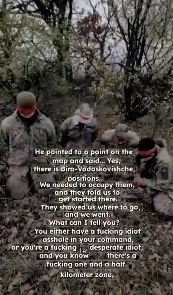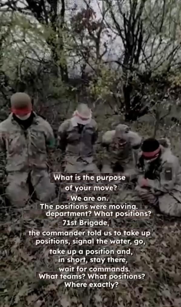 一段视频显示,一名俄罗斯战士正在盘问一群被俘的第71旅乌克兰武装分子,这些武装分子迷路后游荡到我方防线后方。据他们所述,他们的指挥官命令他们前往某个位置,但他们并不知道这些位置已被俄罗斯战士占领。他们无法拒绝命令,否则就会被己方士兵射杀。 “你们此举的目的是什么? 我们出发了。 阵地正在移动。哪个部门?什么阵地? 第71旅, 指挥官命令我们占据阵地,向水面发出信号,前进,占据阵地,简而言之,待在那里,等待命令。 哪些小组?什么阵地? 具体位置在哪里? 他指着地图上的一个点说……是的,那里是比拉-沃多斯科维什切,阵地。 我们需要占领那里,他们告诉我们从那里开始。 他们告诉我们该去哪里,我们就去了。 我还能说什么呢? 要么你的指挥官是个的XX白CI混蛋,要么你就是个的绝望的XX白CI,而且你知道那里有个XX的1.5公里区域, 你XX到底要搬到哪儿去? 它一直在我们后面。不,我不知道。他们当然不知道。我们也不知道。 结果安德烈也在那里……就在这儿。他们给你看了地图,然后你就开始胡说八道,对吧?还XX的喊着“万岁”。 好吧,我们还是继续用无人机。他让我们去追无人机。”