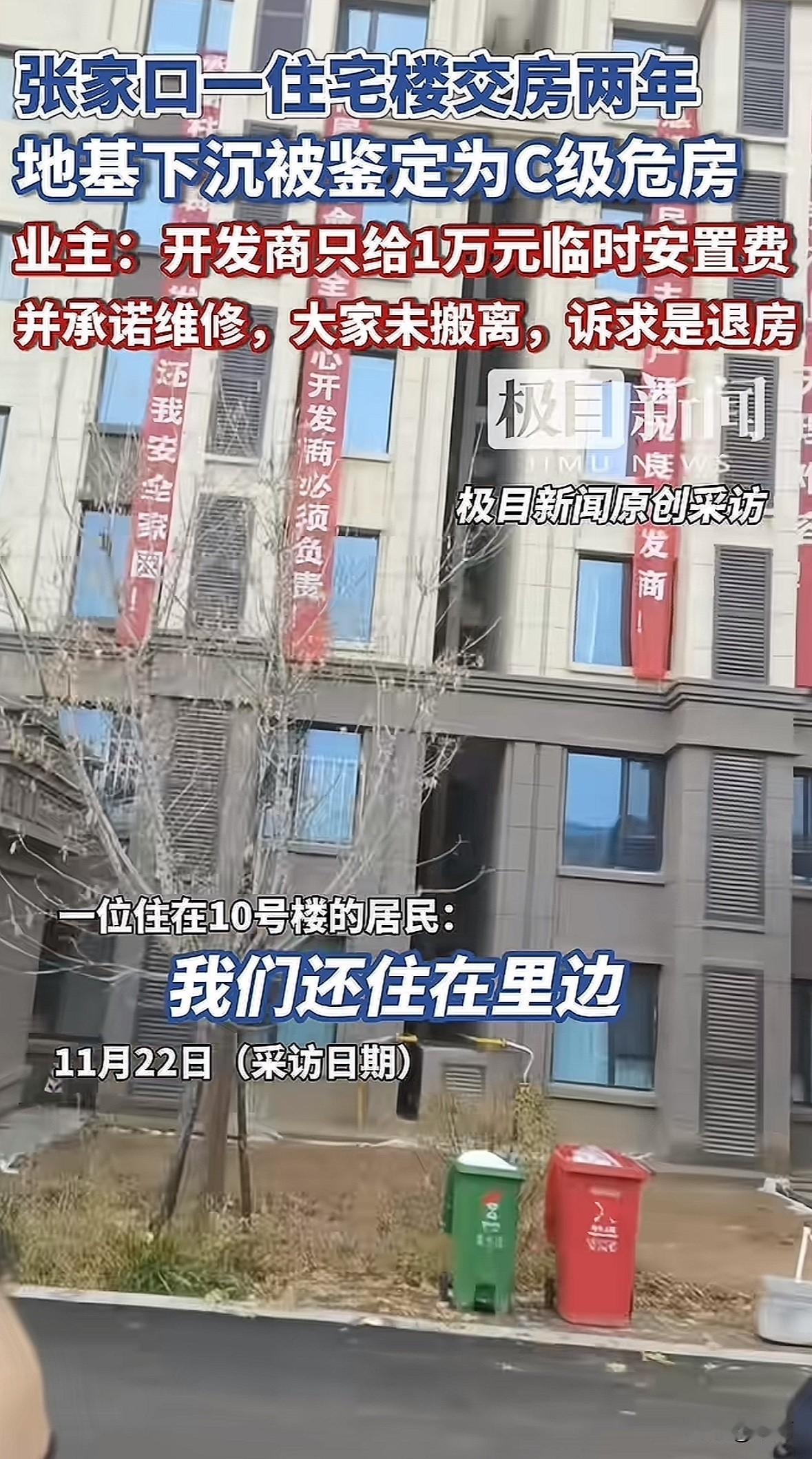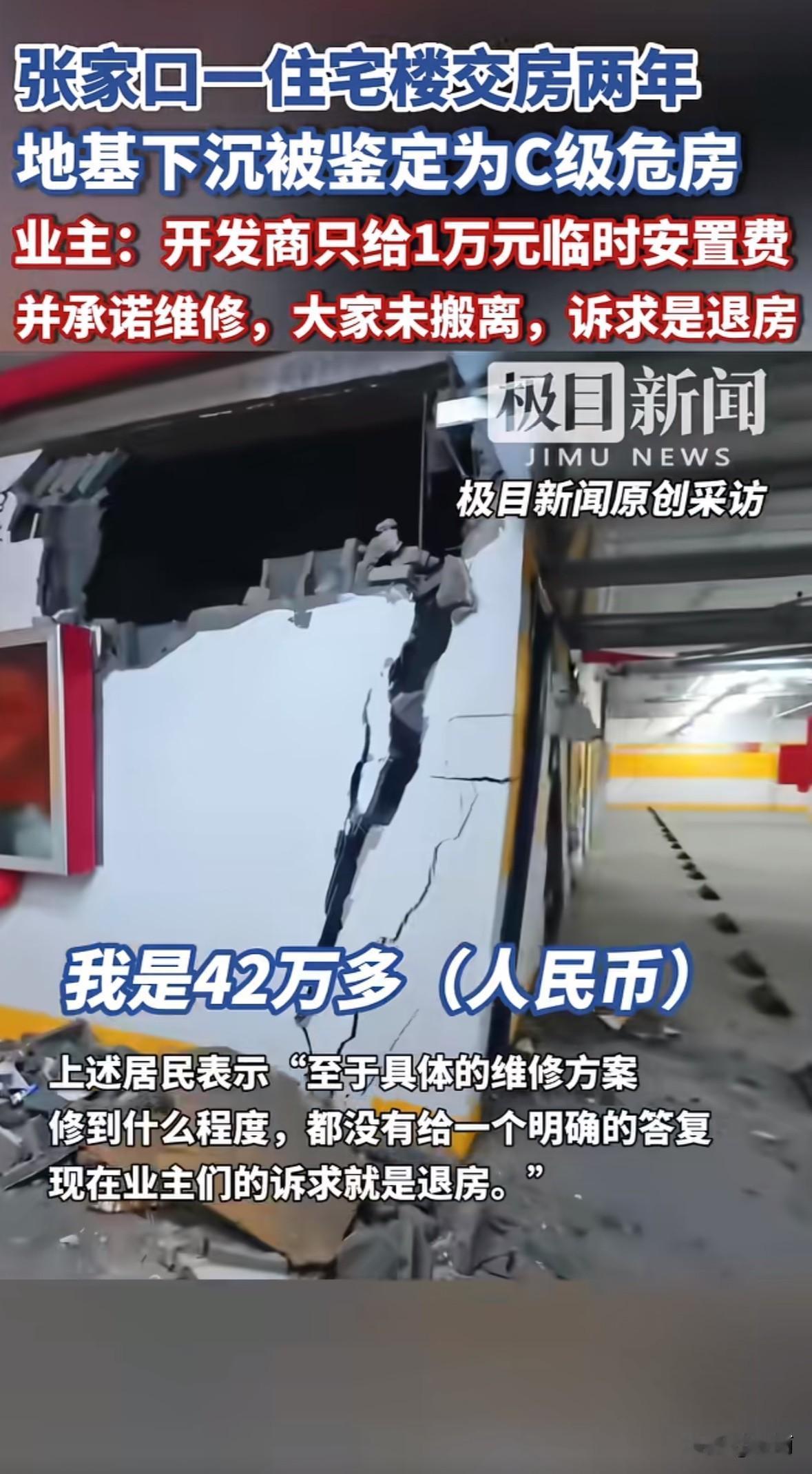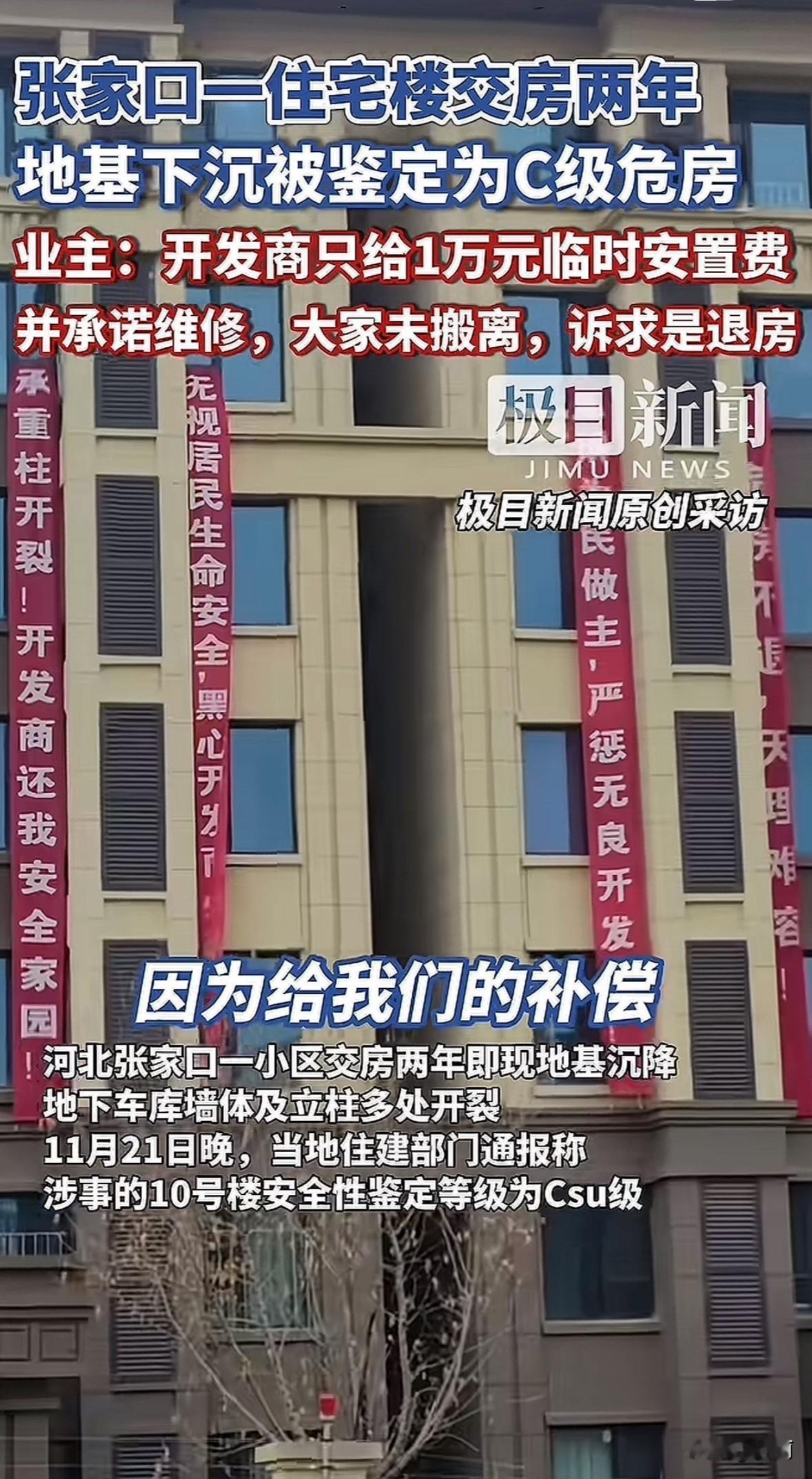 张家口荣盛城A5区10号楼2023年6月交房,才两年就出现地基下沉,家里瓷砖、地下车库墙体立柱都裂了。官方鉴定是Csu级局部危房,部分承重结构不达标,已经不适宜居住了。开发商给每户1万元补助,说要维修,但没给明确方案。业主花40到50万买房,装修还花不少,现在都想退房,没愿意搬的。房子是大事,关系到身家安全,交房两年就成危房,实在让人揪心。希望相关部门能盯紧点,不管是维修还是退房,都得给业主一个靠谱的解决方案,也得查查质量问题到底出在哪,别让大家花了血汗钱还住得提心吊胆。