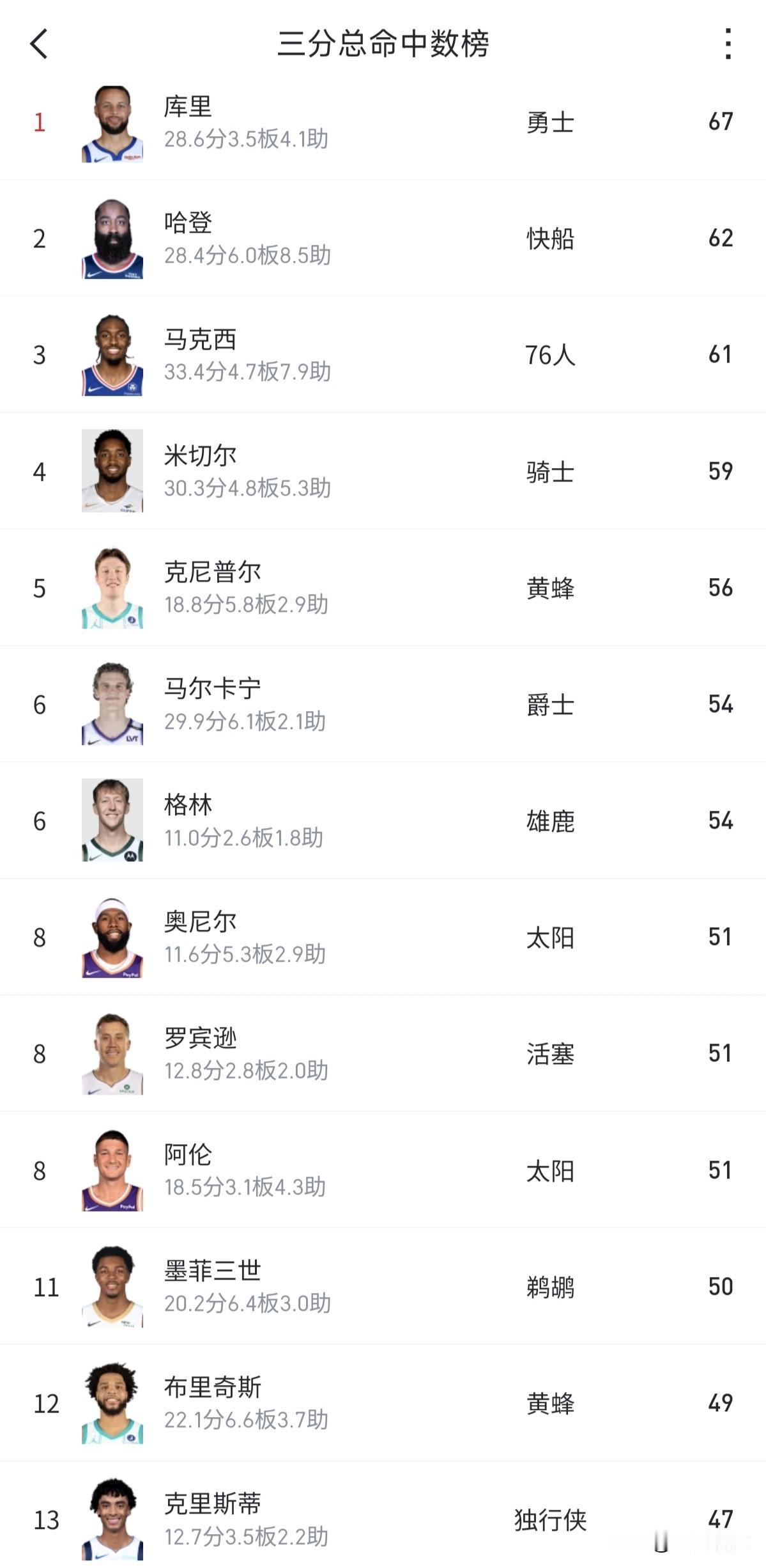 真的没想到本赛季三分投中最多的还是库里和哈登,他们也是NBA历史三分榜前两位,目前两人相差五个三分,也许就一场比赛的差距。马克西排名第三还算可以,比较意外的是排名第五的普尔,他是今年的四号新秀,如果长期保持未来还是很有期待性的。