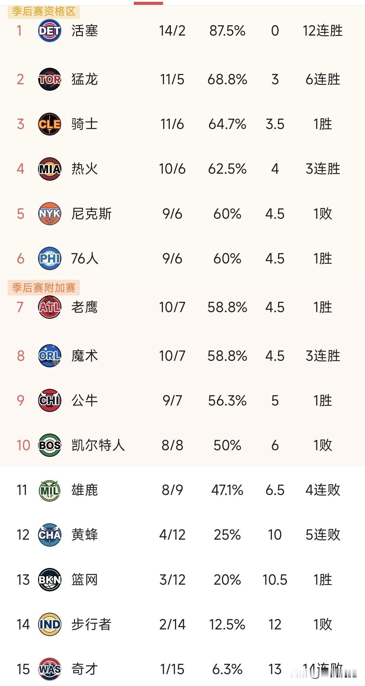 活塞12连胜了,今天送雄鹿四连败正式跌出东部前十,公牛今天送奇才14连败,本赛季他们想翻身的可能性很低了,今天东部球队比赛少些,排名变化不是很大,现在最大看点就是活塞什么时候输,奇才什么时候赢。雄鹿和凯尔特人的当家球星都缺席,哪些球队会趁机会捡漏呢?
