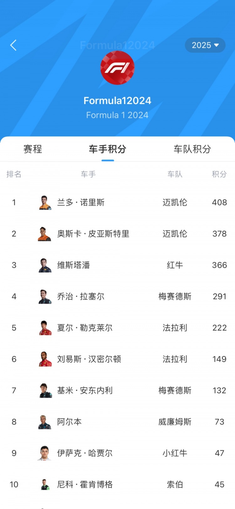 截至目前车手积分榜,诺里斯408分领跑,皮亚斯特里378分紧随其后(落后30分),维斯塔潘以366分缩小差距(落后42分)。