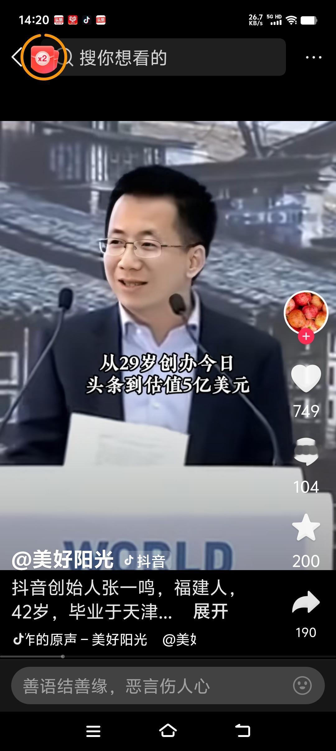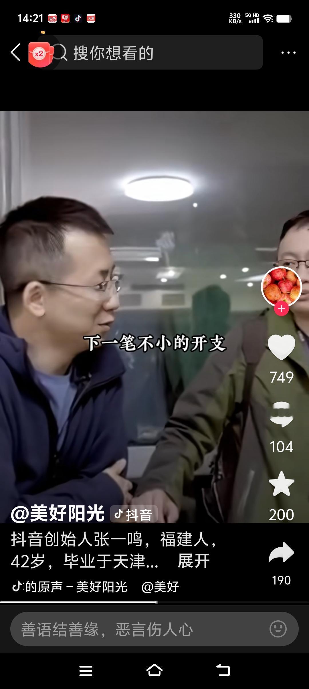 玩了两年头条,才知道头条的创始人是张一鸣! 张一鸣毕业于天津南开大学,租住的居民楼里,最大的会议室才有50平米,他说工作室小但是想法可以很大了啊! 有的同事刚刚入职两天,就离开了,看到公司太小, 太不正规了,厨房离得很近,甚至工作的时候可以闻到饭菜的香味! 就这样在小小的斗室中字节跳动公司跳出了小小的空间,应运而生,公司的第一个产品就是条头,接下来有出来了抖音! 张一鸣说,他不喜欢洗车不喜欢打高尔夫,只喜欢做产品和有趣的人聊天! 入职两天离开的员工也许会后悔的,如果坚持也许会成为一个小有名气的股东! 2025年3月,抖音和抖音极速版的月活跃用户规模突破10亿大关,达到10.01亿。 2025年8月数据显示今日头条日活跃用户约1.2亿 。 2025年9月另一数据称日活跃用户达2.7亿 。 创始人张一鸣真是了得!