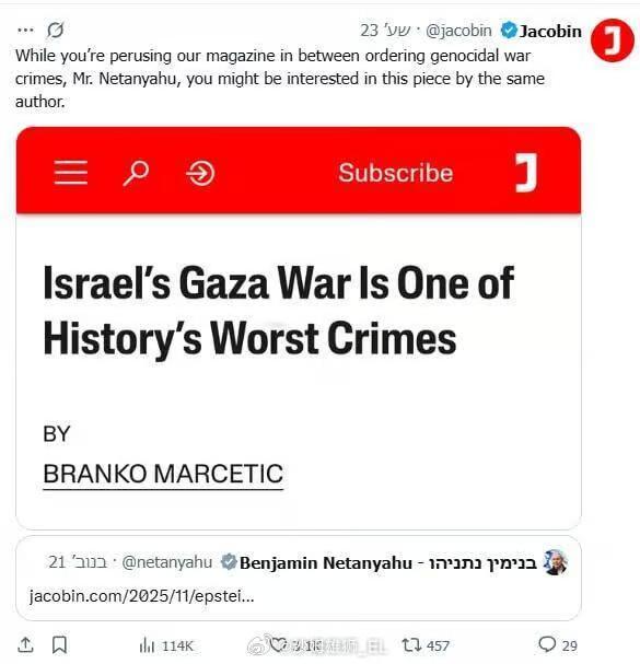 内塔尼亚胡干的一件蠢事,他用官方账号转发了《雅各宾》杂志的一篇文章,内容是爱泼斯坦自称干预以色列选举,帮助以色列前总理埃胡德·巴拉克重返政坛 11月22日内塔尼亚胡干的一件蠢事,他用官方账号转发了《雅各宾》杂志的一篇文章,内容是爱泼斯坦自称干预以色列选举,帮助以色列前总理埃胡德·巴拉克重返政坛(图1-2)。这个行为在以色列国内引发渲染大波,因为内塔尼亚胡确实是蠢得挂相了,他光顾着打击政敌,却全然无视这篇文章的大部分内容都是谈论“爱泼斯坦是摩萨德特工”、“以色列通过间谍爱泼斯坦控制西方权贵阶层”等反以内容,而且《雅各宾》杂志本身就是坚定的反以色列媒体。这种行为...就相当于佩泽什基安转发美国之音的一篇骂伊朗的文章来攻击贾利利。当地时间22日晚上,以色列反对派在特拉维夫组织新的大规模抗议活动(图3-4),要求追究内塔尼亚胡在加沙战争期间的军事失败责任。