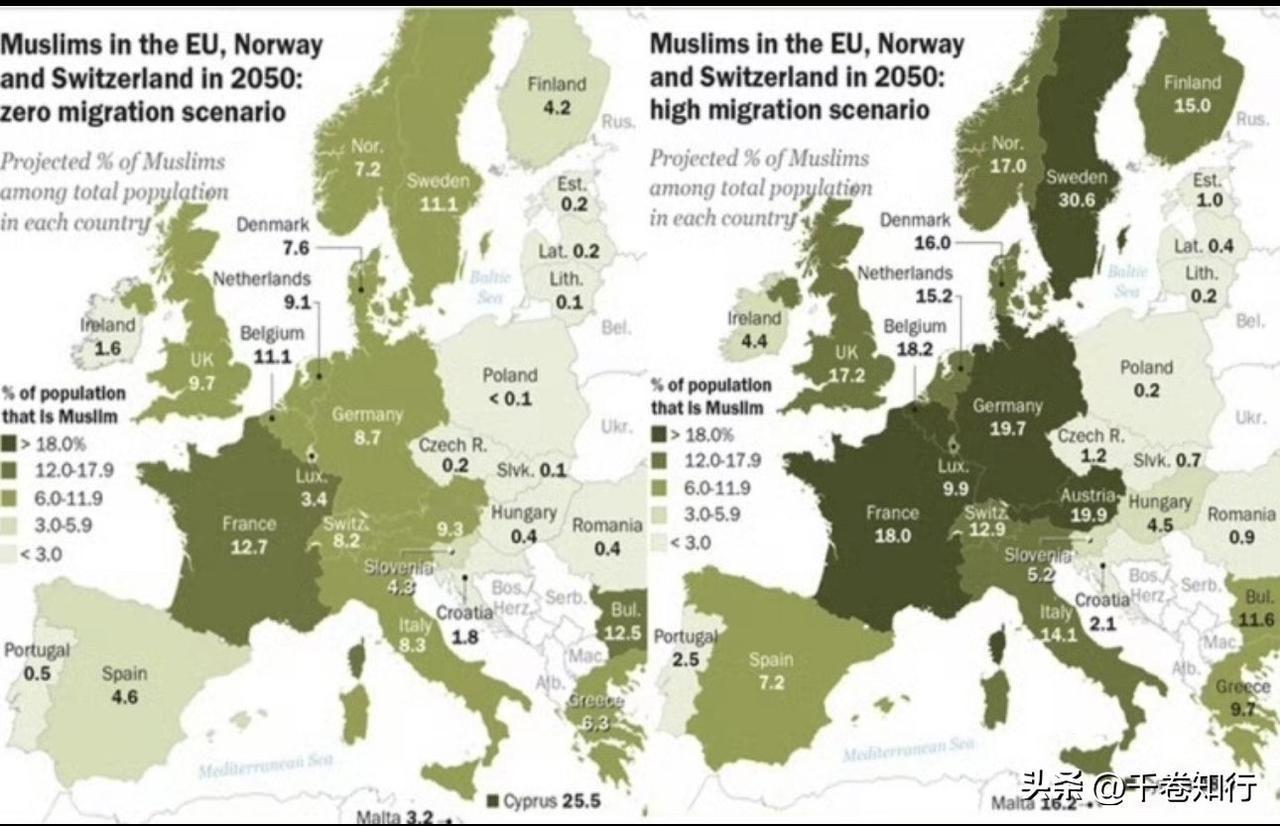你们看那个欧洲2050年的人口预测没? 真是看得人头皮发麻。 瑞典都要变成“瑞典斯坦”了,30%多啊,这以后去斯德哥尔摩旅游,估计得以为到了中东。🇩🇪🇩🇪 其实这事儿吧,咱们国内吃瓜群众早就看明白了,就欧洲那帮“圣母”还在装睡。 你说这古兰经里的那些规矩,咱也不多评价,但关键是人家真信啊,而且真的按那个生孩子。反观欧洲本地人,不婚不育保平安,这怎么玩? 最有意思的是,这图表里还提了一嘴俄罗斯,说老毛子那边已经20%了。不过我看普京大帝还能镇得住,毕竟手段硬。但你指望法国、德国那帮靠选票吃饭的政客去解决这个问题?悬。 现在的欧洲就像是温水煮青蛙,水都快开了,青蛙还在那儿讨论水温是不是不够“包容”。等到哪天真过了那个不可逆的临界点,两手一摊,大家一起念经吧。🌚 全球人口对比