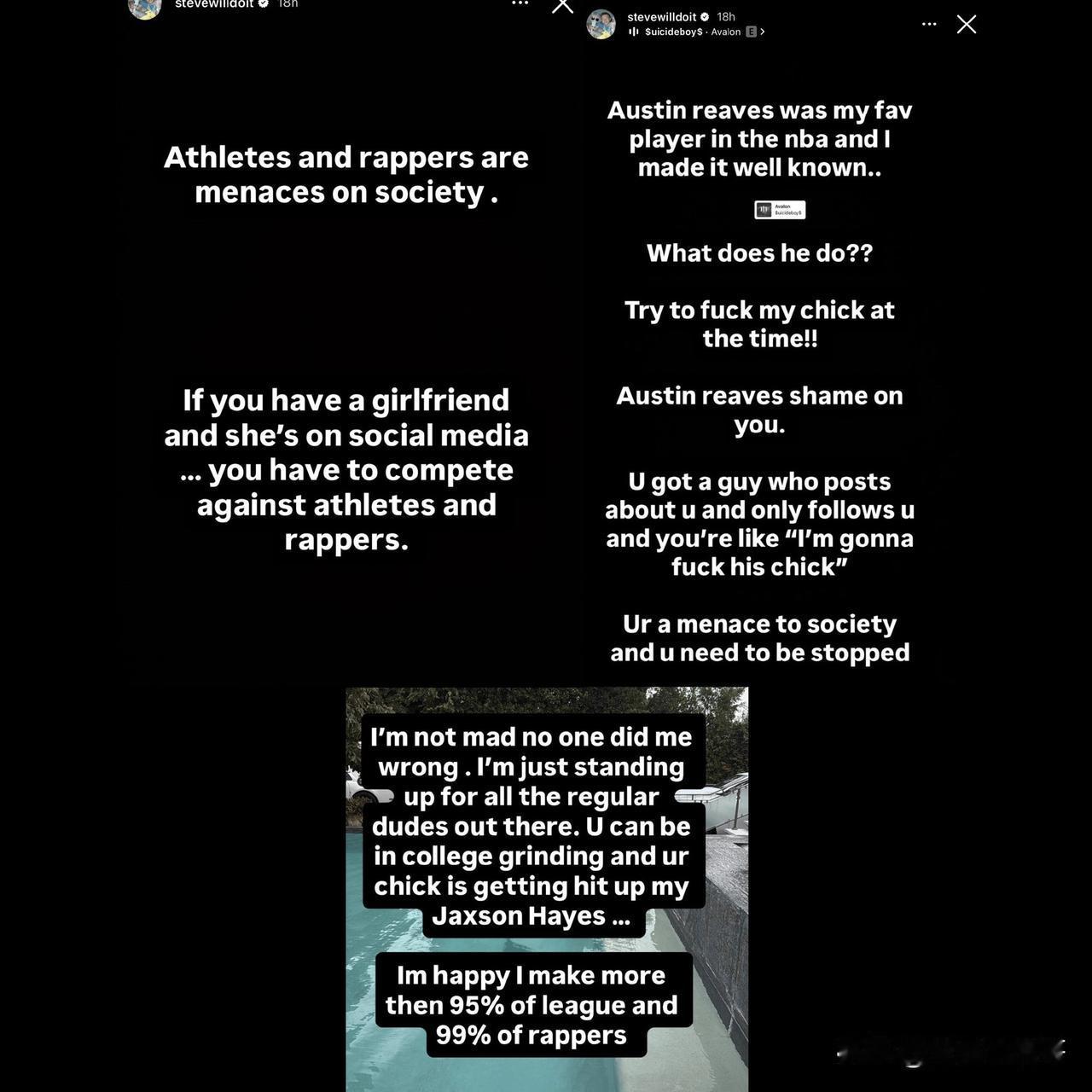 里夫斯被点名了!!!网红球迷指控里夫斯引诱他的女友! 湖人后卫里夫斯又火了,这次他不是因为打球火的,而是因为混乱的场外生活,难道是小里也没忍得住外界诱惑。 国外一名网红球迷SteveWillDoIt在社媒中表示,他指控湖人球员里夫斯试图和他的女友有关系。 这个网红不知道是不是为了博眼球,最近里夫斯确实比较火,但是说里夫斯和他的女友就有点情况,如果不是真的那就是为了炒作。 目前里夫斯并没有任何回应,前段时间一直在打比赛,谁有空考虑这些,最近他们赛程不忙,看看下周是否有新的进展。 里夫斯 湖人队控卫