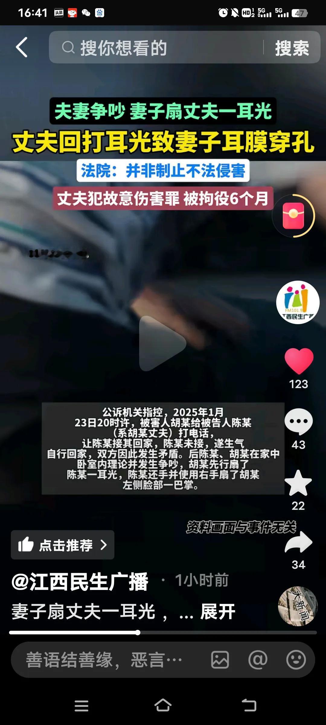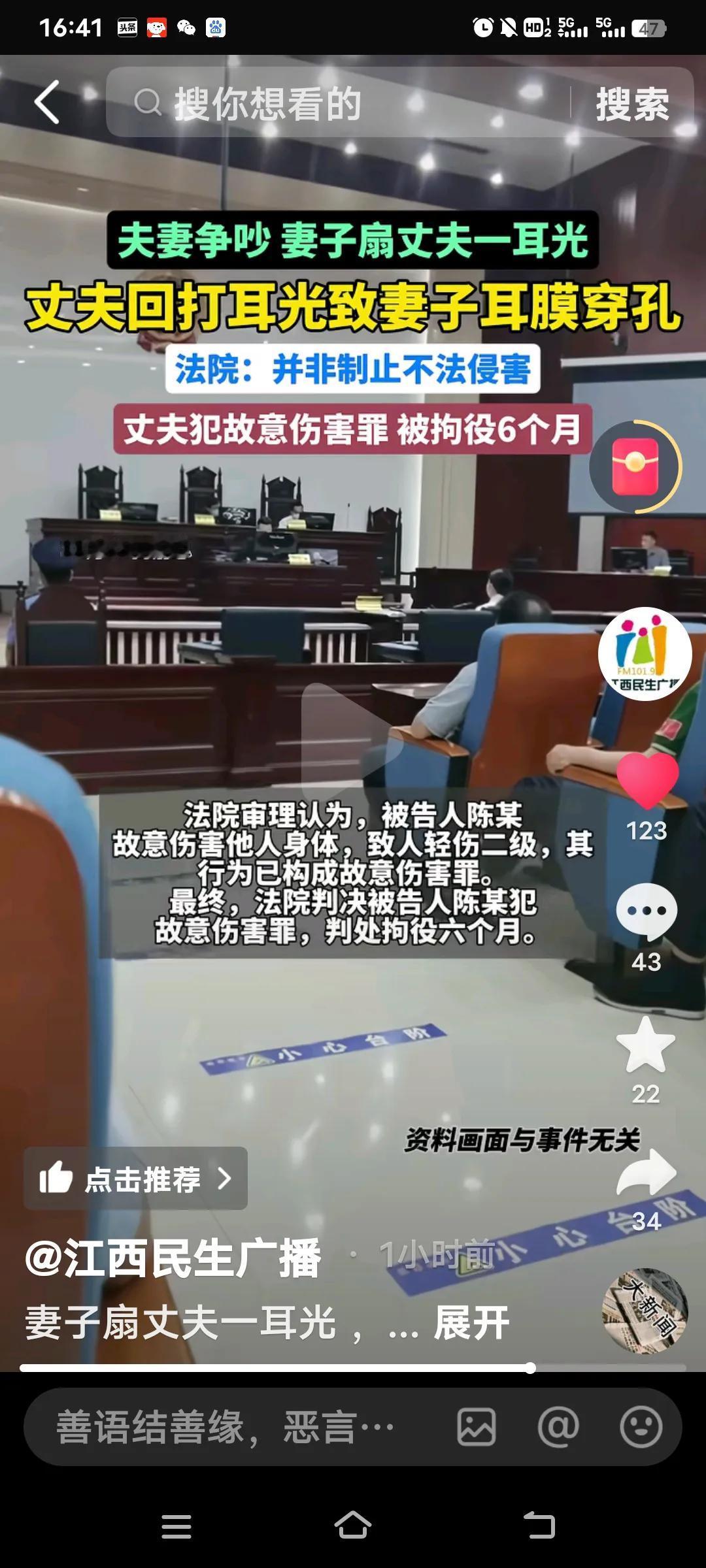 四川大英县这起夫妻吵架的案件,实在令人唏嘘不已。2025年1月的一个夜晚,胡女士让丈夫陈某来接她,然而陈某并未接听电话,胡女士怒气冲冲地回了家。两人见面后,争吵愈演愈烈,胡女士率先扇了陈某一耳光,陈某反手回击,这一巴掌后果极为严重,致使胡女士左侧耳膜穿孔,构成轻伤二级。 此事闹上了法庭,陈某被公诉机关以故意伤害罪提起诉讼。庭审时,其辩护人认为这属于家庭纠纷,且陈某的行为属于防卫过当,请求从轻处罚并判处缓刑,可法院并未采纳这一意见。 最终,陈某被判处拘役6个月。这无疑是冲动带来的惨痛代价,夫妻之间动起手来,谁能料到一巴掌竟会换来半年的拘役呢?大家一定要控制好自己的情绪啊!评论区里,有网友感慨:“这才是四川的法院。”也有人表示:“以后远离女人,别还手了,打伤了就是你的错。”夫妻之间的事儿,又有谁能说得清楚呢? 夫妻纠纷 夫妻吵架感悟 夫妻间吵架