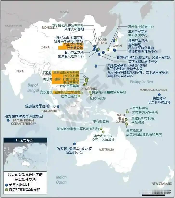 美国全球军事基地分布图,我们何时能形成类似的规模呢? 美国是如今唯一一个具备全球体系化作战的国家!美军将全球分为6大战区,通过多达数百个的海外军事基地,控制了全球最重要的战略位置,并对中国、俄国实现了封锁和包围! 例如在亚太地区,美国铁杆盟友有日本、韩国、澳大利亚等,不仅大力扶持小弟,还在众多国家设立军事基地,其战略前线直达目标门口,一旦发生战争,可以迅速集结力量,完整部署! 相比而言,我们现在综合力量与美国尚有较大差距,最主要是海外盟友和海外基地不足,战略空间有限,主要还是以近海防御为主,太被动!