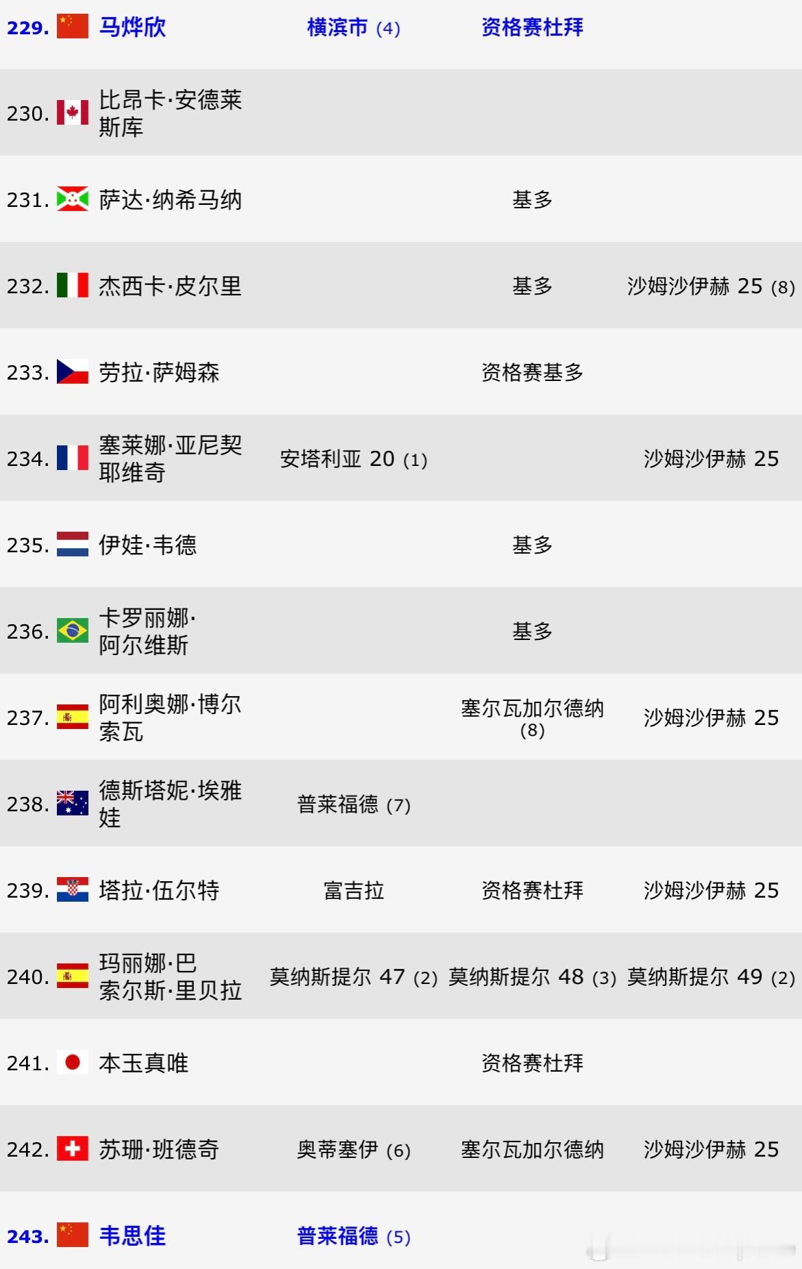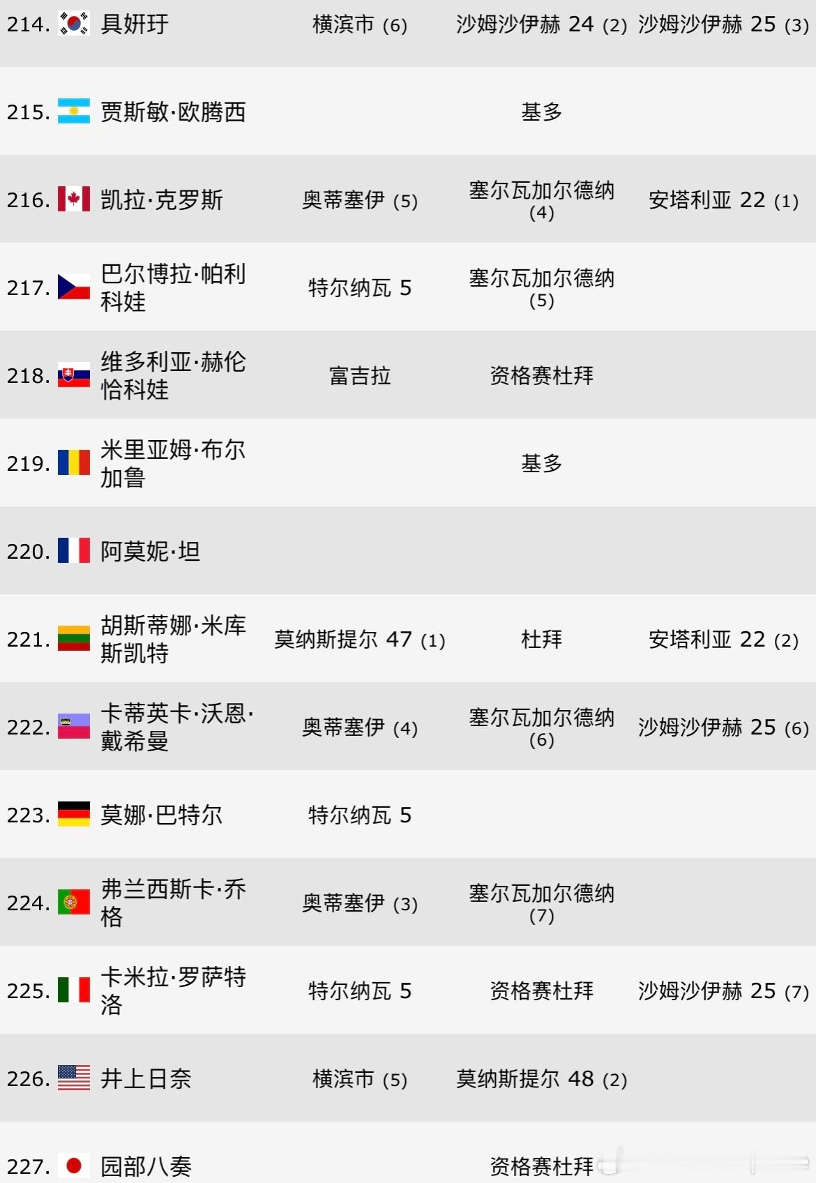 澳网资格赛竞争:除了刚才发的澳网正选段的球员都在疯狂拿分之外,资格赛这一段竞争也很激烈!215-270 的球员都在努力中…目前马烨欣、韦思佳在这一段竞争2025澳网 资格赛最后入围:2252025美网 资格赛 最后入围 :228小马去年澳网238无缘、美网232 无缘。目前小马即时排名229 不过还有🇯🇵 横滨W50- 🇦🇪迪拜W100 资格赛 两站比赛韦思佳 去年澳网直接突围进正选,目前即时排名243 差的不算多,这周🇦🇺W75 还有一丝丝机会入围。大家觉得两个人还有机会吗?