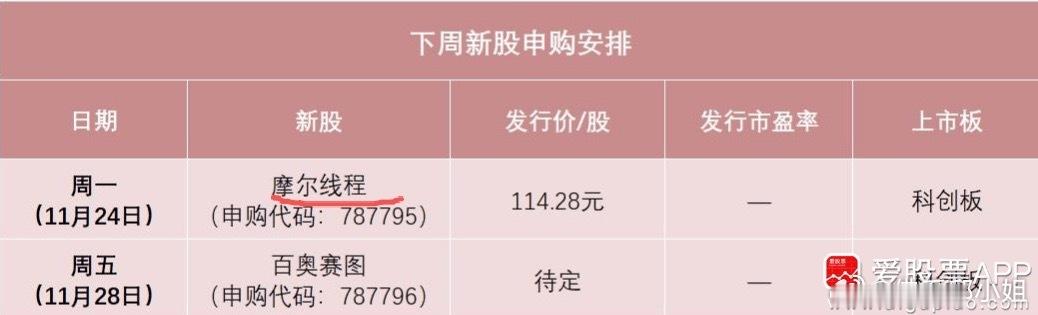 下周回本的机会来了,明天摩尔线程能打新了。发行价为114.28元/股,这是今年发行价最高的新股,投资者中一签需缴款57140元!上市只要涨3倍,就能赚16万多;涨5倍赚差不多30万。好家伙,今年80%的股民应该都没赚到30万吧?所以,请具备科创板打新资格的老铁们(市值只需要沪市,但需要开通科创板权限),定好闹钟,不要错过这个大赚一笔的好机会。万一中签了呢。