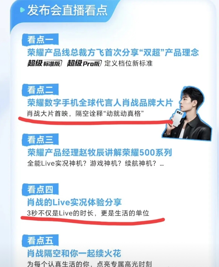 荣耀500发布会直播流程这次有点不一样,我看了下团队是真听劝啊,几乎一半的内容都围绕肖战这个热点大IP去打造热点和流量(荣耀急需的就是热度),而且该机型是线下定位偏多,潜在用户群体就是年轻女性群体,强化对她们的吸引于市场营销是对的。对于像我们这样的数码爱好者而言,压根不需要企业去讲解手机,我们等待的就是个价格,如果合理且产品力不错,我们也是愿意买单的。